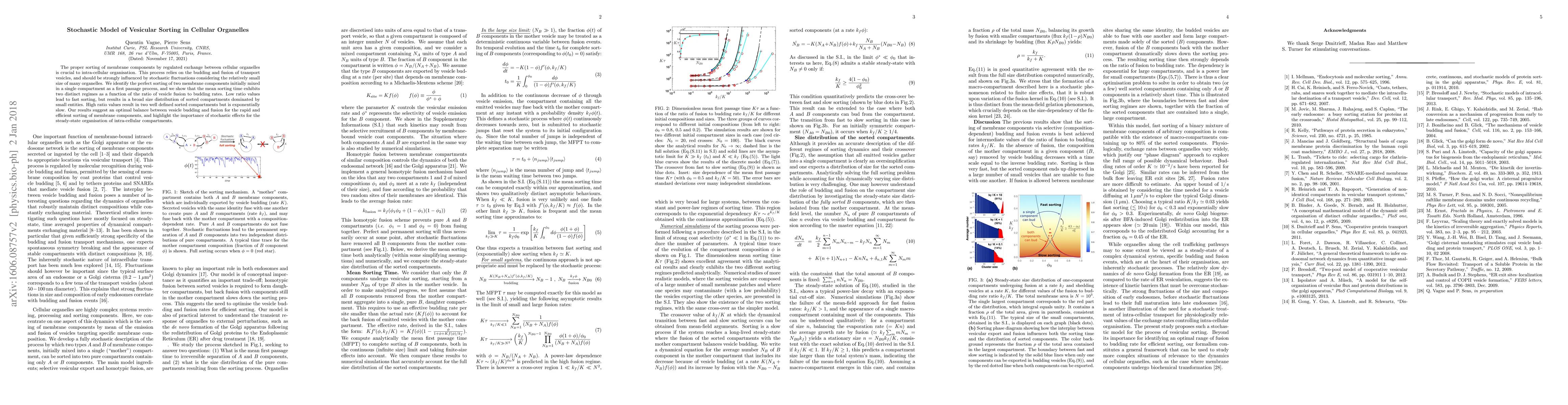 This paper explores the stochastic dynamics of membrane component sorting in cellular organelles, revealing two distinct regimes in sorting time based on vesicle fusion to budding rates. It concludes that an optimal balance between these rates is crucial for efficient sorting, emphasizing the role of stochastic fluctuations in cellular organization.
