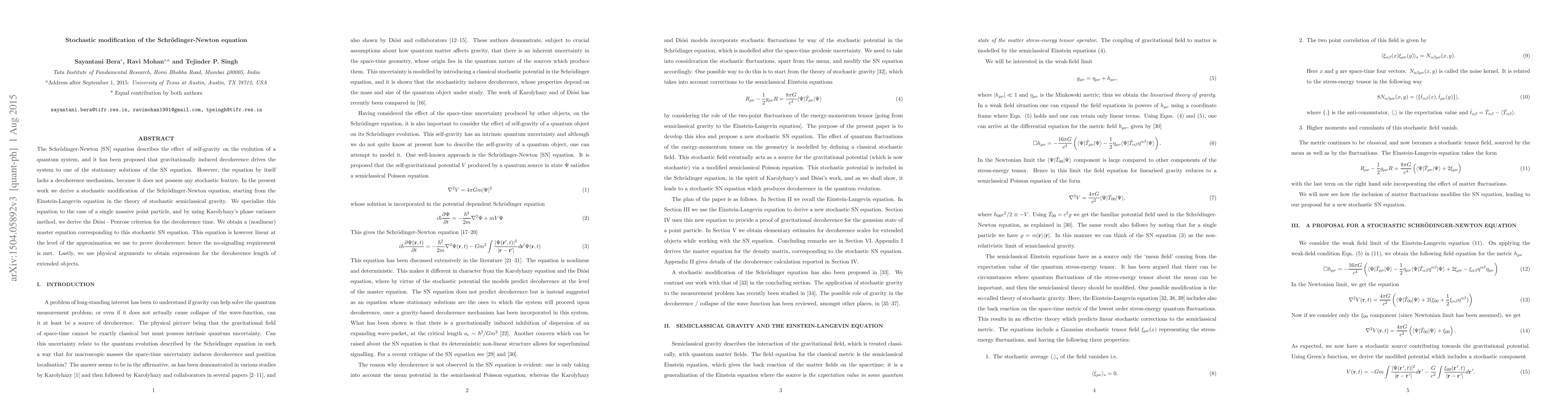 This paper proposes a stochastic modification of the Schrödinger-Newton equation to incorporate a decoherence mechanism, derived from the Einstein-Langevin equation in stochastic semiclassical gravity. The study concludes with a nonlinear master equation for the modified equation, ensuring the no-signalling requirement, and provides expressions for the decoherence length of extended objects.