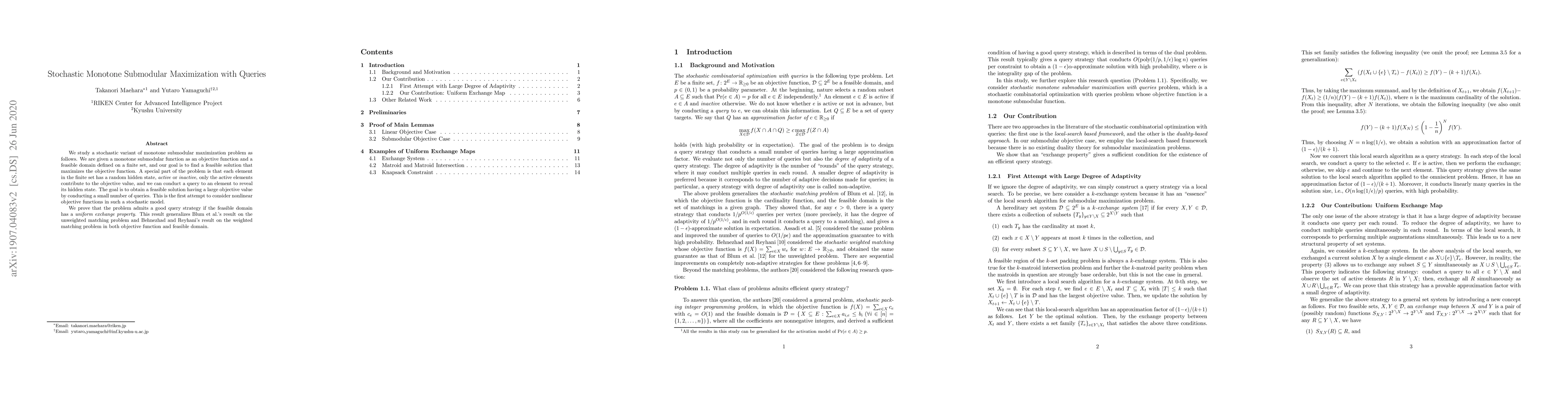 Researchers developed a query strategy for stochastic monotone submodular maximization problems with hidden states, achieving a feasible solution with large objective value using few queries. They proved that the problem admits a good query strategy if the domain has a uniform exchange property.