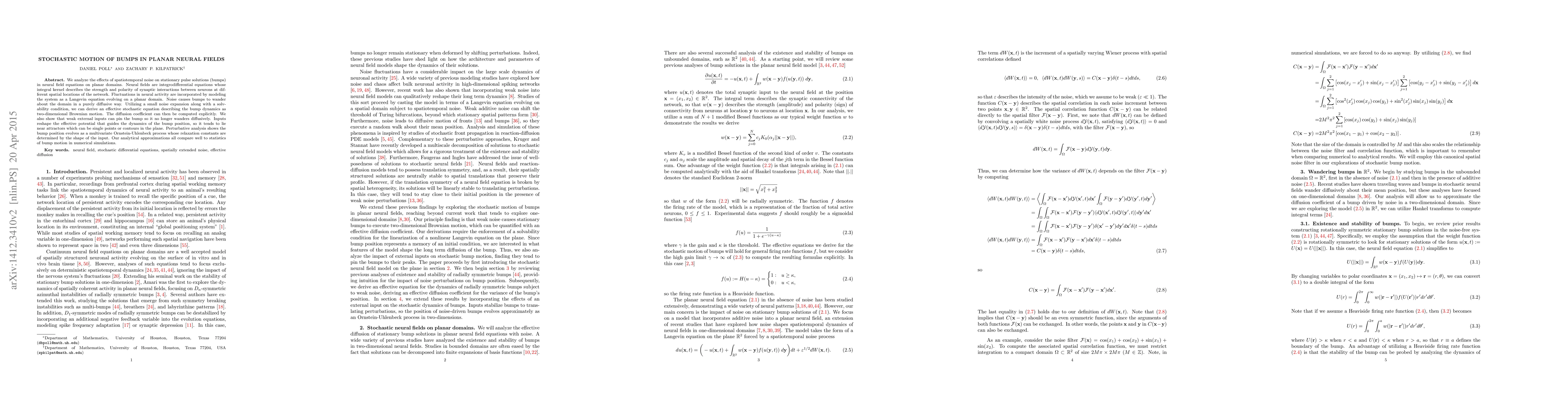 This paper investigates how spatiotemporal noise affects stationary pulse solutions (bumps) in planar neural field equations, showing that noise induces diffusive bump motion modeled by two-dimensional Brownian motion. It also demonstrates that weak external inputs can pin the bump, reshaping its effective potential and guiding its dynamics to attractors.