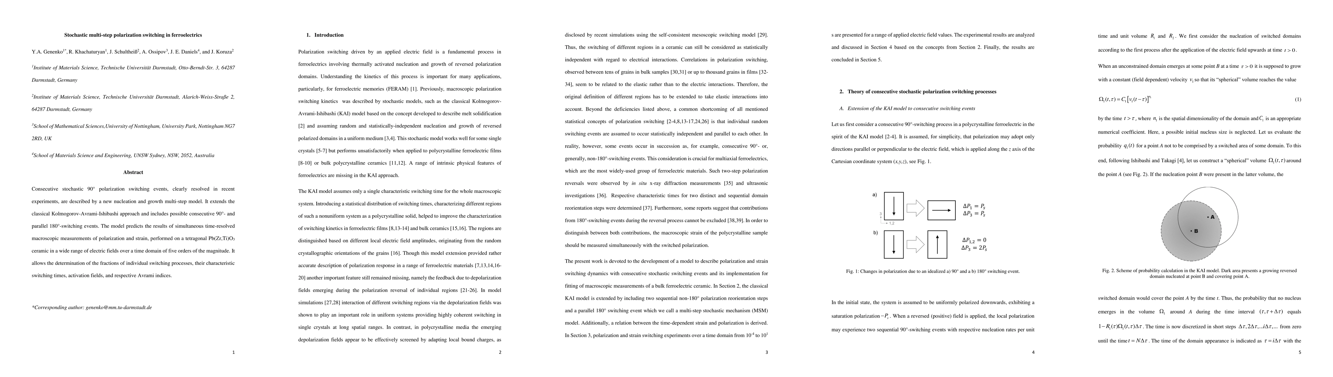 Consecutive stochastic 90{\deg} polarization switching events, clearly resolved in recent experiments, are described by a new nucleation and growth multi-step model. It extends the classical Kolmogorov-Avrami-Ishibashi approach and includes possible consecutive 90{\deg}- and parallel 180{\deg}-switching events. The model predicts the results of simultaneous time-resolved macroscopic measurements of polarization and strain, performed on a tetragonal Pb(Zr,Ti)O3 ceramic in a wide range of electric fields over a time domain of five orders of the magnitude. It allows the determination of the fractions of individual switching processes, their characteristic switching times, activation fields, and respective Avrami indices.