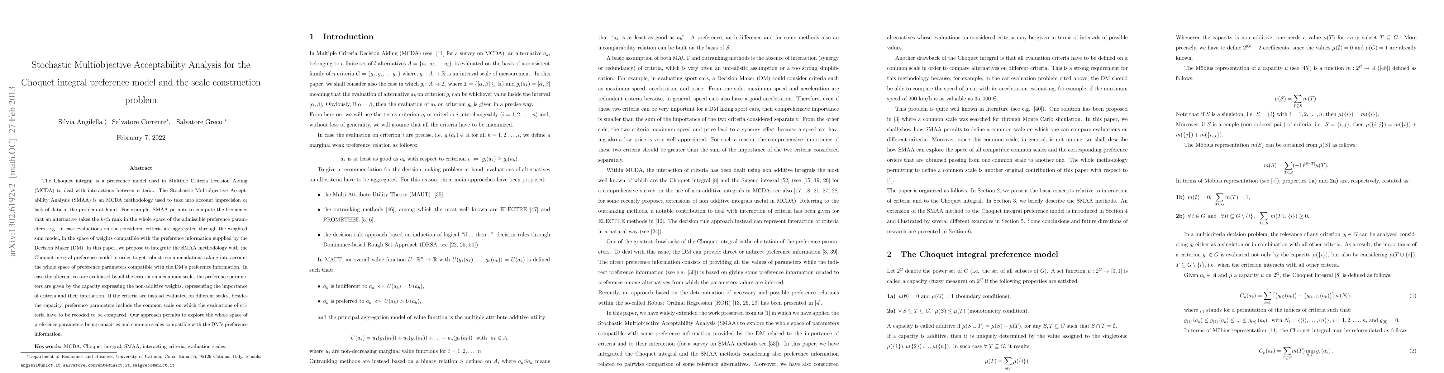 This paper integrates Stochastic Multiobjective Acceptability Analysis with the Choquet integral preference model to provide robust decision recommendations by considering the entire range of preference parameters compatible with the Decision Maker's information. It addresses both scenarios where criteria are evaluated on a common scale and where they are on different scales.
