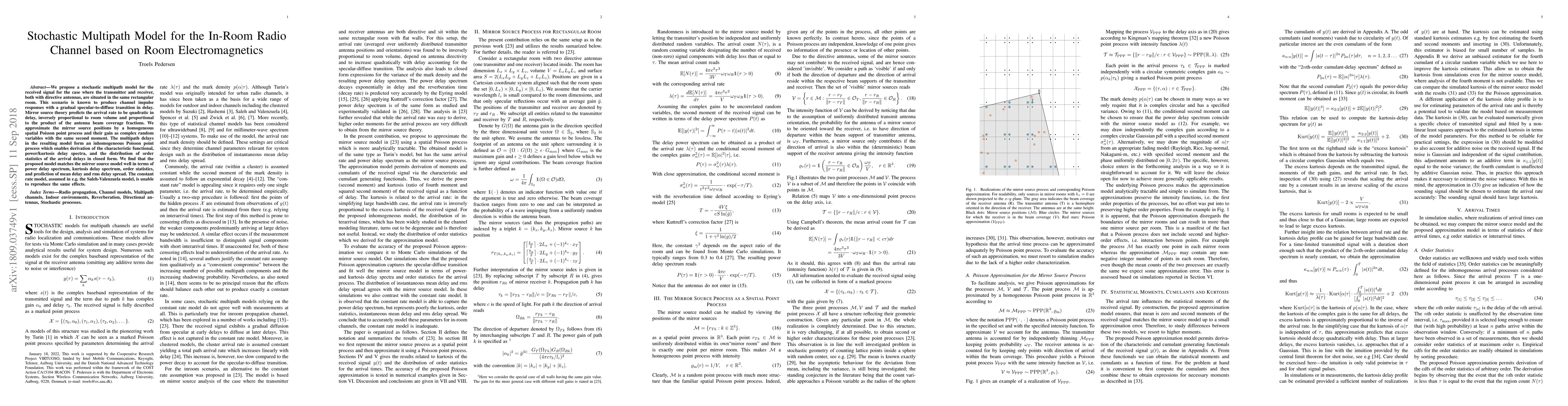 The paper proposes a stochastic multipath model for in-room radio channels using room electromagnetics, approximating mirror source positions with a homogeneous spatial Poisson point process and their gains as complex random variables with the same second moment.