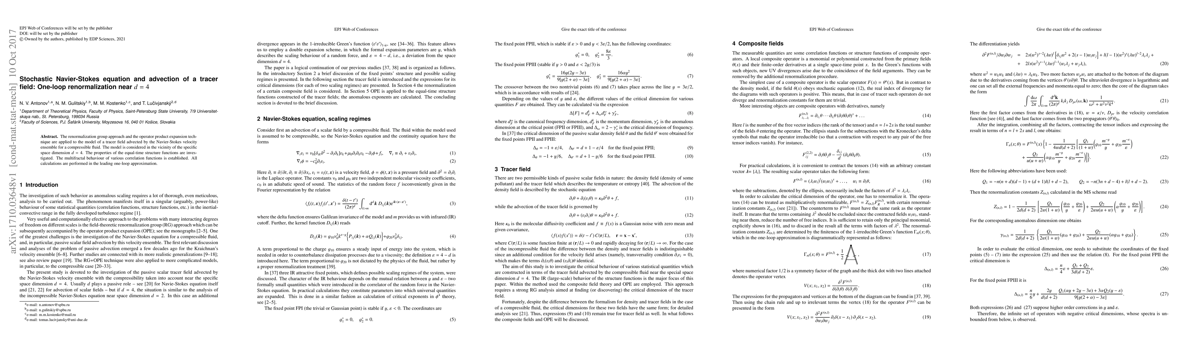 This paper applies the renormalization group and operator product expansion to study the advection of a tracer field by the Navier-Stokes velocity ensemble near $d=4$ dimensions, focusing on the equal-time structure functions and establishing multifractal behavior in correlation functions through one-loop calculations.