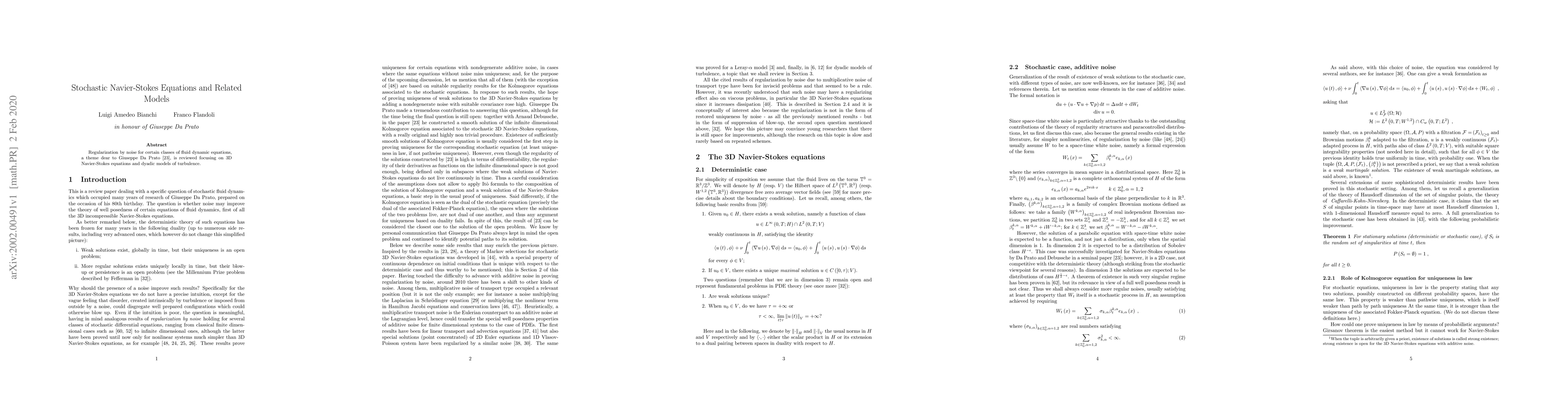 This paper reviews the concept of noise-induced regularization in fluid dynamics, particularly focusing on the 3D Navier-Stokes equations and their dyadic turbulence models, building on the foundational work of Giuseppe Da Prato and A. Debussche.