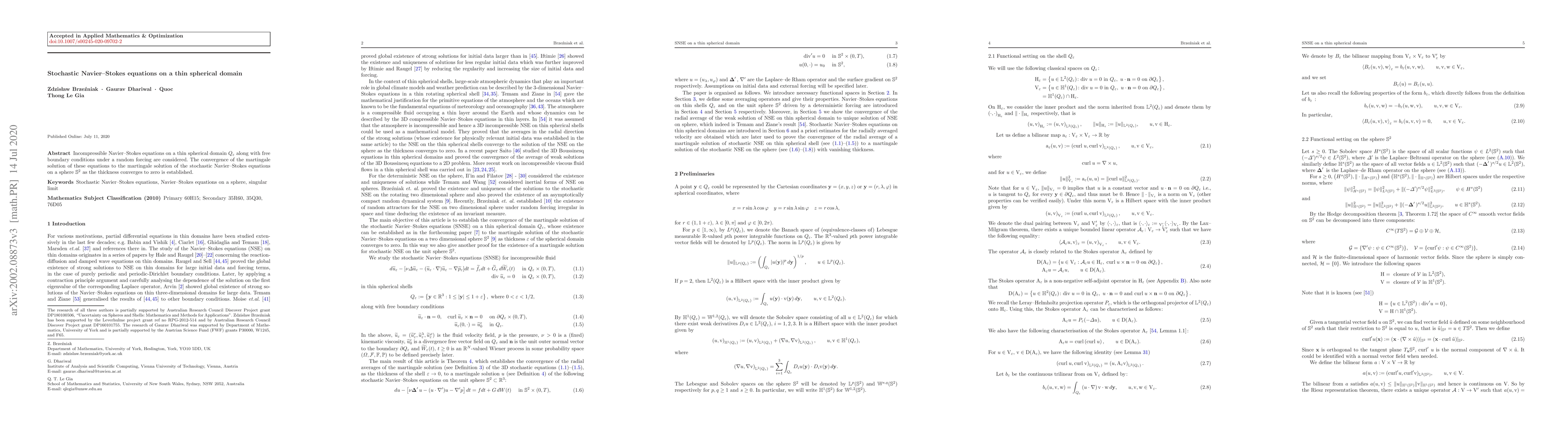 This paper investigates the stochastic Navier-Stokes equations on a thin spherical domain with random forcing and free boundary conditions. It establishes the convergence of the martingale solution in the thin domain to the solution on a full sphere as the thickness approaches zero.