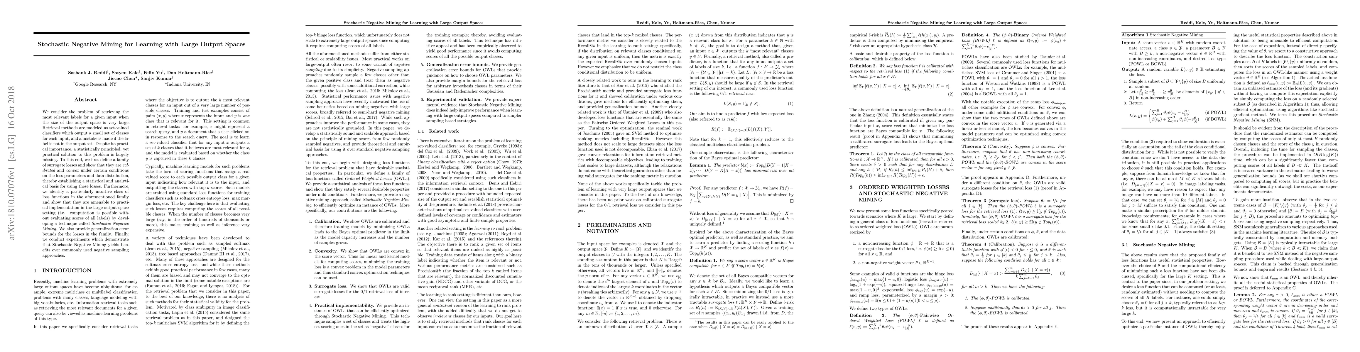 We consider the problem of retrieving the most relevant labels for a given input when the size of the output space is very large. Retrieval methods are modeled as set-valued classifiers which output a small set of classes for each input, and a mistake is made if the label is not in the output set. Despite its practical importance, a statistically principled, yet practical solution to this problem is largely missing. To this end, we first define a family of surrogate losses and show that they are calibrated and convex under certain conditions on the loss parameters and data distribution, thereby establishing a statistical and analytical basis for using these losses. Furthermore, we identify a particularly intuitive class of loss functions in the aforementioned family and show that they are amenable to practical implementation in the large output space setting (i.e. computation is possible without evaluating scores of all labels) by developing a technique called Stochastic Negative Mining. We also provide generalization error bounds for the losses in the family. Finally, we conduct experiments which demonstrate that Stochastic Negative Mining yields benefits over commonly used negative sampling approaches.
