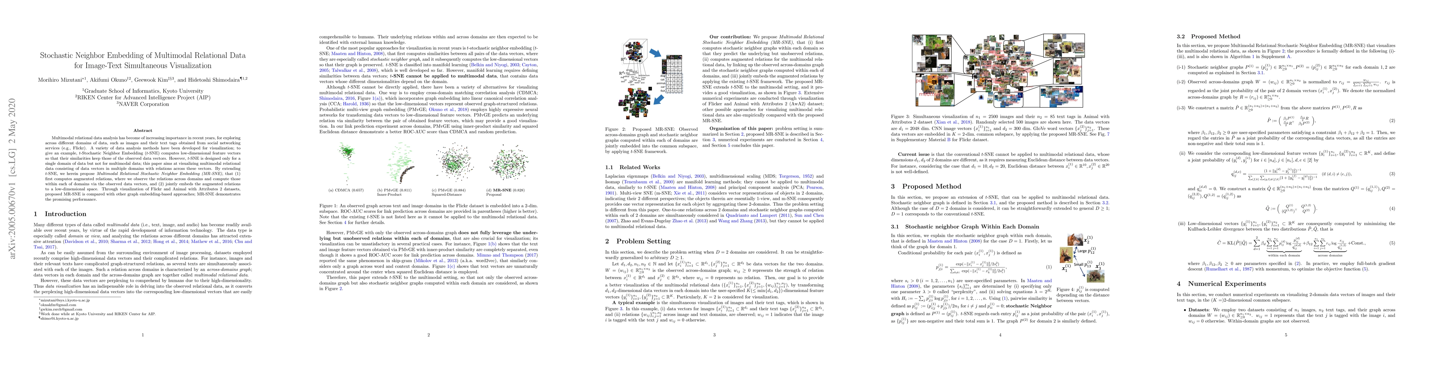 This paper proposes Multimodal Relational Stochastic Neighbor Embedding (MR-SNE) to visualize multimodal relational data, extending t-SNE for joint embedding of data across multiple domains. MR-SNE computes augmented relations and embeds them in low-dimensional space, showing promising performance in visualizing Flickr and Animal with Attributes 2 datasets.