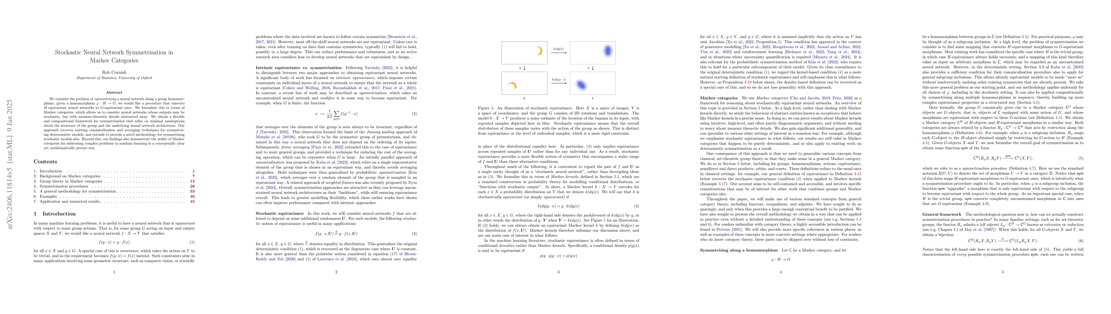 We consider the problem of symmetrising a neural network along a group homomorphism: given a homomorphism $\varphi : H \to G$, we would like a procedure that converts $H$-equivariant neural networks into $G$-equivariant ones. We formulate this in terms of Markov categories, which allows us to consider neural networks whose outputs may be stochastic, but with measure-theoretic details abstracted away. We obtain a flexible, compositional, and generic framework for symmetrisation that relies on minimal assumptions about the structure of the group and the underlying neural network architecture. Our approach recovers existing methods for deterministic symmetrisation as special cases, and extends directly to provide a novel methodology for stochastic symmetrisation also. Beyond this, we believe our findings also demonstrate the utility of Markov categories for addressing problems in machine learning in a conceptual yet mathematically rigorous way.