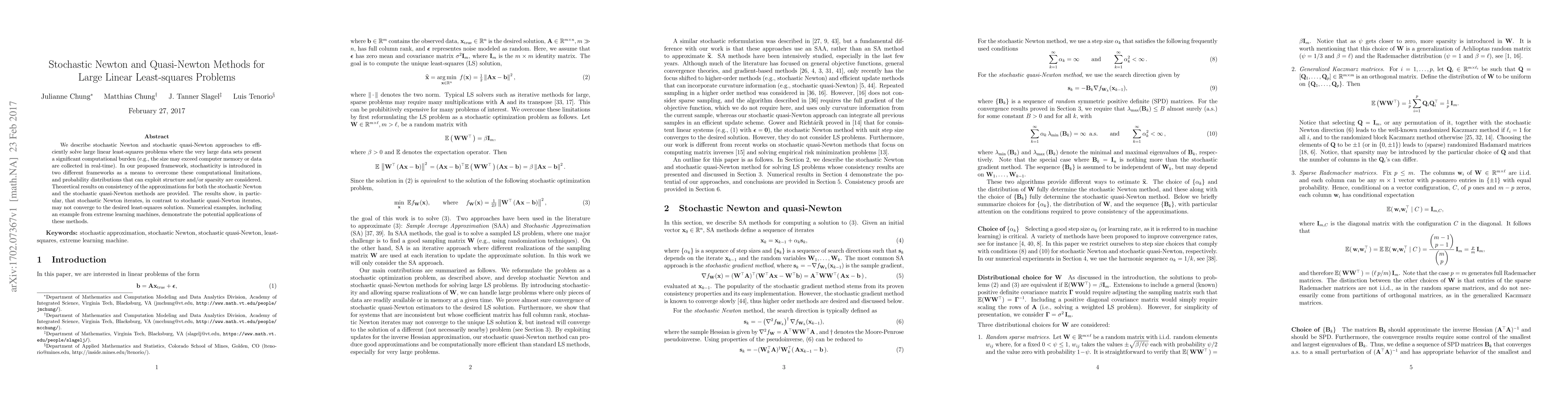 We describe stochastic Newton and stochastic quasi-Newton approaches to efficiently solve large linear least-squares problems where the very large data sets present a significant computational burden (e.g., the size may exceed computer memory or data are collected in real-time). In our proposed framework, stochasticity is introduced in two different frameworks as a means to overcome these computational limitations, and probability distributions that can exploit structure and/or sparsity are considered. Theoretical results on consistency of the approximations for both the stochastic Newton and the stochastic quasi-Newton methods are provided. The results show, in particular, that stochastic Newton iterates, in contrast to stochastic quasi-Newton iterates, may not converge to the desired least-squares solution. Numerical examples, including an example from extreme learning machines, demonstrate the potential applications of these methods.