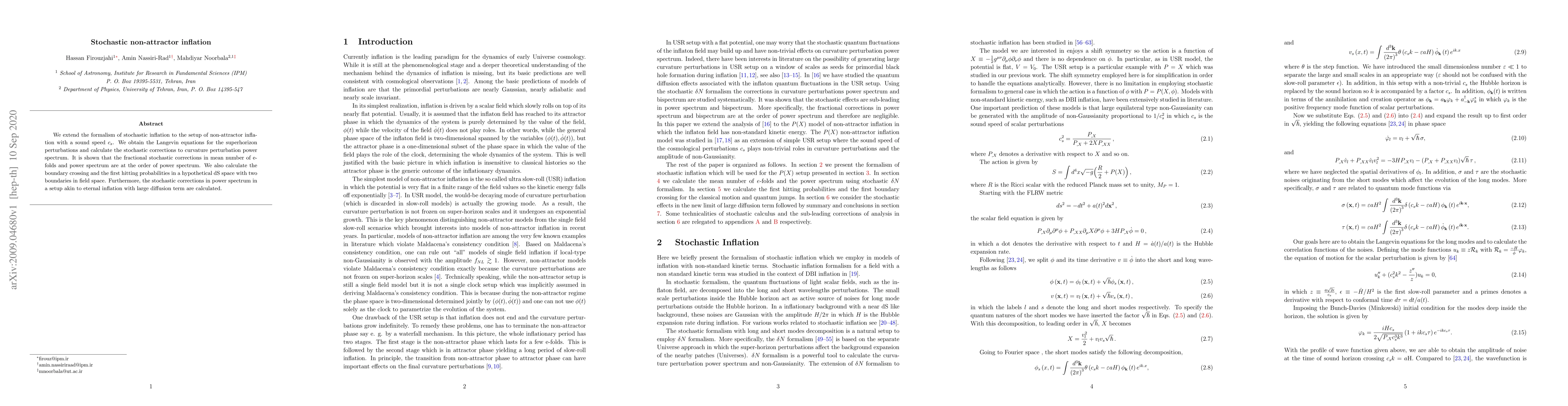 This paper extends stochastic inflation to non-attractor models, deriving Langevin equations for superhorizon perturbations and calculating stochastic corrections to the curvature perturbation power spectrum. It finds that these corrections are comparable to the power spectrum and analyzes boundary crossing probabilities in hypothetical de Sitter space.