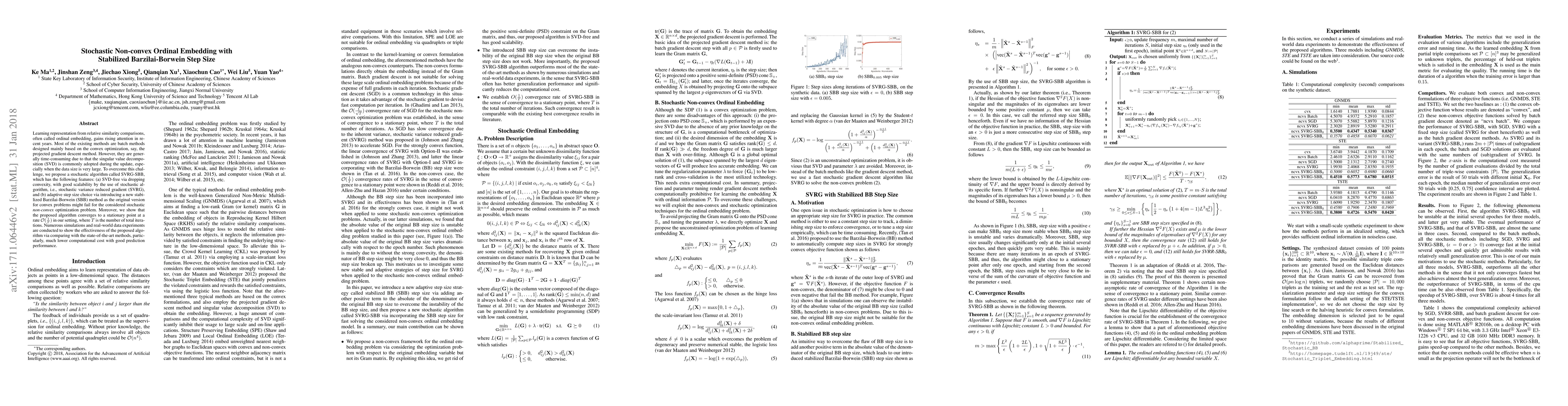 This paper proposes a stochastic algorithm, SVRG-SBB, for non-convex ordinal embedding that avoids the time-consuming SVD used in batch methods. The algorithm leverages stochastic variance reduced gradient (SVRG) and a stabilized Barzilai-Borwein step size for adaptive optimization, achieving $\mathcal{O}(\frac{1}{T})$ convergence rate and demonstrating lower computational costs and comparable performance to state-of-the-art methods.