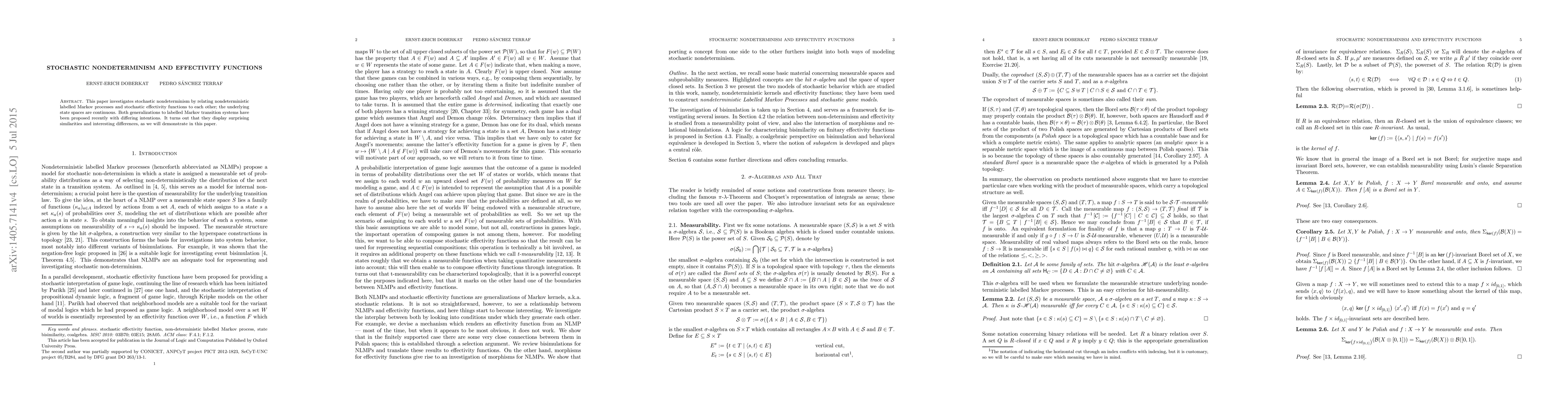 This paper investigates stochastic nondeterminism on continuous state spaces by relating nondeterministic kernels and stochastic effectivity functions to each other. Nondeterministic kernels are functions assigning each state a set o subprobability measures, and effectivity functions assign to each state an upper-closed set of subsets of measures. Both concepts are generalizations of Markov kernels used for defining two different models: Nondeterministic labelled Markov processes and stochastic game models, respectively. We show that an effectivity function that maps into principal filters is given by an image-countable nondeterministic kernel, and that image-finite kernels give rise to effectivity functions. We define state bisimilarity for the latter, considering its connection to morphisms. We provide a logical characterization of bisimilarity in the finitary case. A generalization of congruences (event bisimulations) to effectivity functions and its relation to the categorical presentation of bisimulation are also studied.