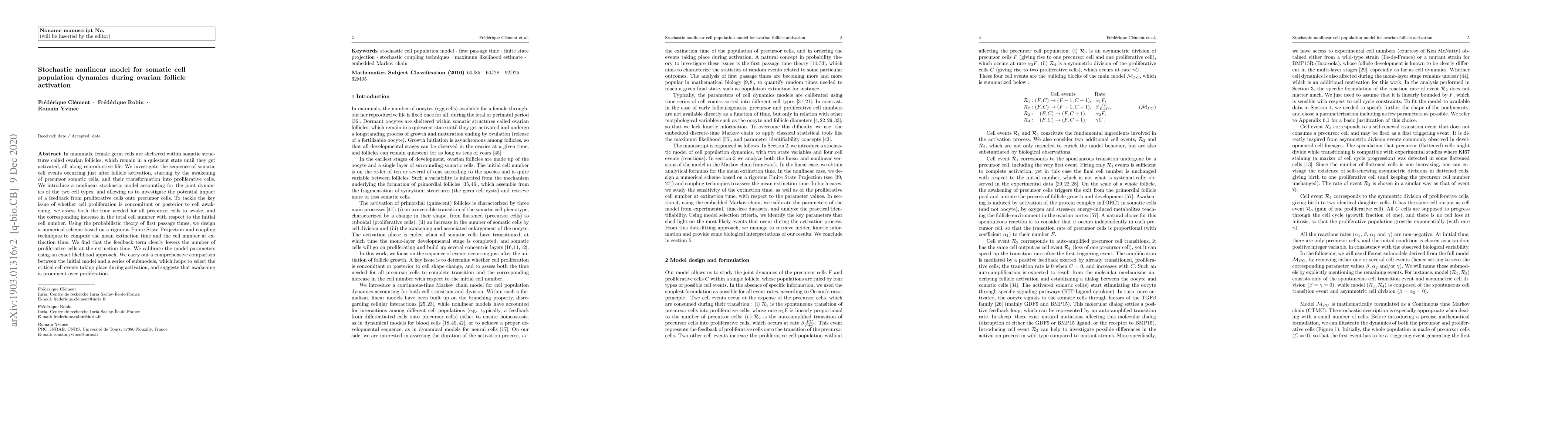 In mammals, female germ cells are sheltered within somatic structures called ovarian follicles, which remain in a quiescent state until they get activated, all along reproductive life. We investigate the sequence of somatic cell events occurring just after follicle activation, starting by the awakening of precursor somatic cells, and their transformation into proliferative cells. We introduce a nonlinear stochastic model accounting for the joint dynamics of the two cell types, and allowing us to investigate the potential impact of a feedback from proliferative cells onto precursor cells. To tackle the key issue of whether cell proliferation is concomitant or posterior to cell awakening, we assess both the time needed for all precursor cells to awake, and the corresponding increase in the total cell number with respect to the initial cell number. Using the probabilistic theory of first passage times, we design a numerical scheme based on a rigorous Finite State Projection and coupling techniques to compute the mean extinction time and the cell number at extinction time. We find that the feedback term clearly lowers the number of proliferative cells at the extinction time. We calibrate the model parameters using an exact likelihood approach. We carry out a comprehensive comparison between the initial model and a series of submodels, which helps to select the critical cell events taking place during activation, and suggests that awakening is prominent over proliferation.