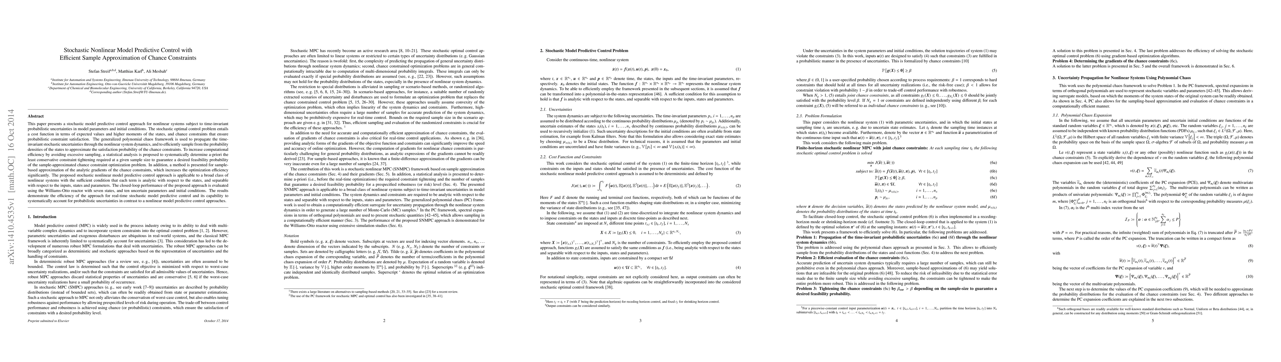 This paper proposes a stochastic nonlinear model predictive control method that efficiently handles probabilistic uncertainties using the generalized polynomial chaos framework. It introduces a sample-based approximation for chance constraints, optimizing computational efficiency through constraint tightening and gradient approximation, and demonstrates its effectiveness on the Williams-Otto reactor.