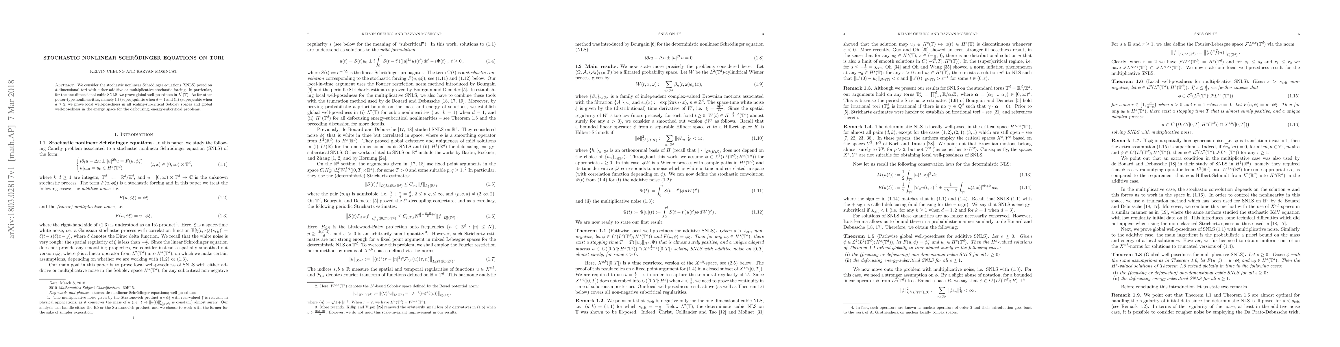 This paper investigates stochastic nonlinear Schrödinger equations on $d$-dimensional tori with additive or multiplicative noise. It proves global well-posedness for the one-dimensional cubic case in $L^2(\mathbb{T})$ and local well-posedness for higher-order nonlinearities in scaling-subcritical Sobolev spaces, along with global well-posedness in the energy space for defocusing, energy-subcritical problems.