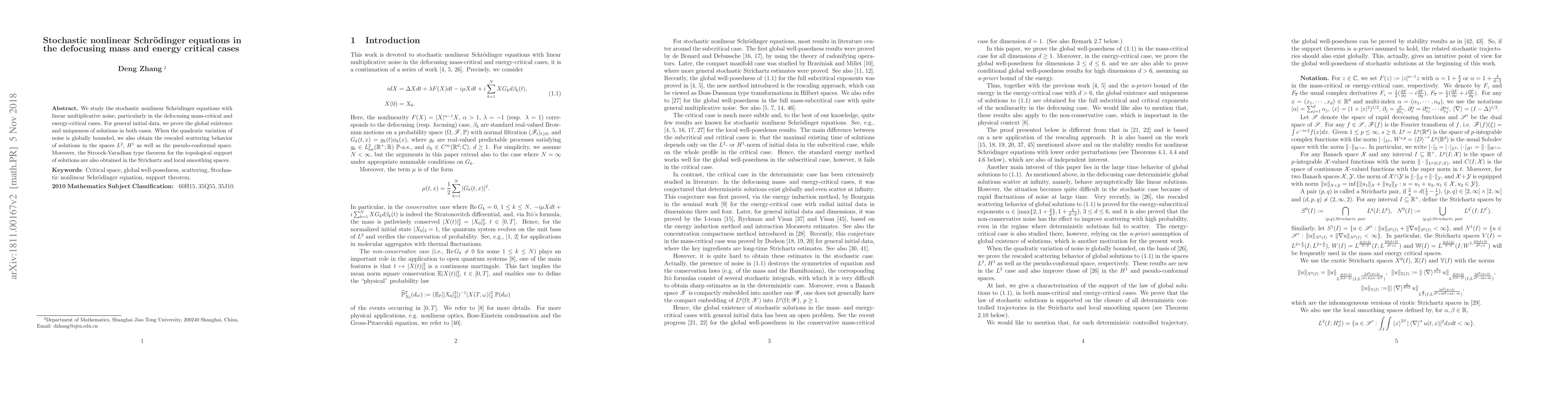 This paper investigates the stochastic nonlinear Schrödinger equations with multiplicative noise in the defocusing mass-critical and energy-critical cases, proving global existence and uniqueness of solutions. It also demonstrates rescaled scattering behavior and obtains a Stroock-Varadhan type theorem for the topological support of solutions in various function spaces.