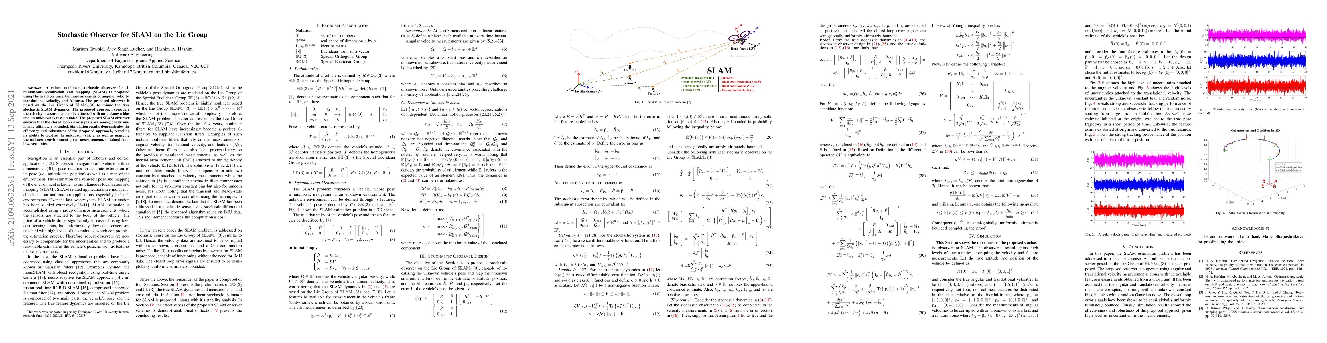 A robust nonlinear stochastic observer for simultaneous localization and mapping (SLAM) is proposed using the available uncertain measurements of angular velocity, translational velocity, and features. The proposed observer is posed on the Lie Group of $\mathbb{SLAM}_{n}\left(3\right)$ to mimic the true stochastic SLAM dynamics. The proposed approach considers the velocity measurements to be attached with an unknown bias and an unknown Gaussian noise. The proposed SLAM observer ensures that the closed loop error signals are semi-globally uniformly ultimately bounded. Simulation results demonstrates the efficiency and robustness of the proposed approach, revealing its ability to localize the unknown vehicle, as well as mapping the unknown environment given measurements obtained from low-cost units.