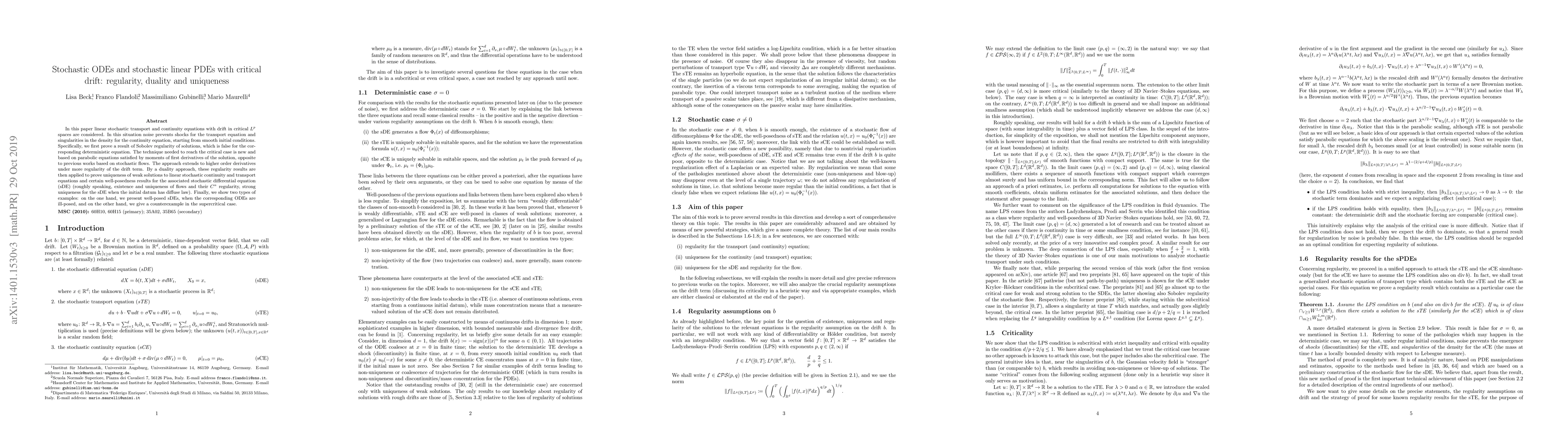 In this paper linear stochastic transport and continuity equations with drift in critical $L^{p}$ spaces are considered. In this situation noise prevents shocks for the transport equation and singularities in the density for the continuity equation, starting from smooth initial conditions. Specifically, we first prove a result of Sobolev regularity of solutions, which is false for the corresponding deterministic equation. The technique needed to reach the critical case is new and based on parabolic equations satisfied by moments of first derivatives of the solution, opposite to previous works based on stochastic flows. The approach extends to higher order derivatives under more regularity of the drift term. By a duality approach, these regularity results are then applied to prove uniqueness of weak solutions to linear stochastic continuity and transport equations and certain well-posedness results for the associated stochastic differential equation (sDE) (roughly speaking, existence and uniqueness of flows and their $C^\alpha$ regularity, strong uniqueness for the sDE when the initial datum has diffuse law). Finally, we show two types of examples: on the one hand, we present well-posed sDEs, when the corresponding ODEs are ill-posed, and on the other hand, we give a counterexample in the supercritical case.