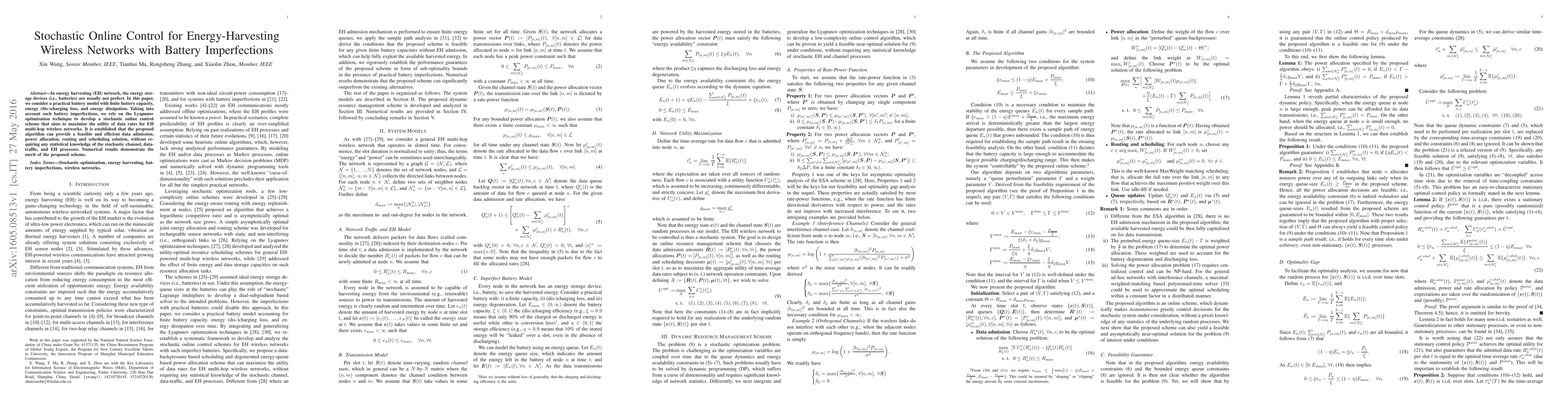The paper presents a novel stochastic online control algorithm for energy-harvesting wireless networks that accounts for battery imperfections, ensuring feasible and efficient resource allocation without requiring statistical knowledge of underlying random processes.