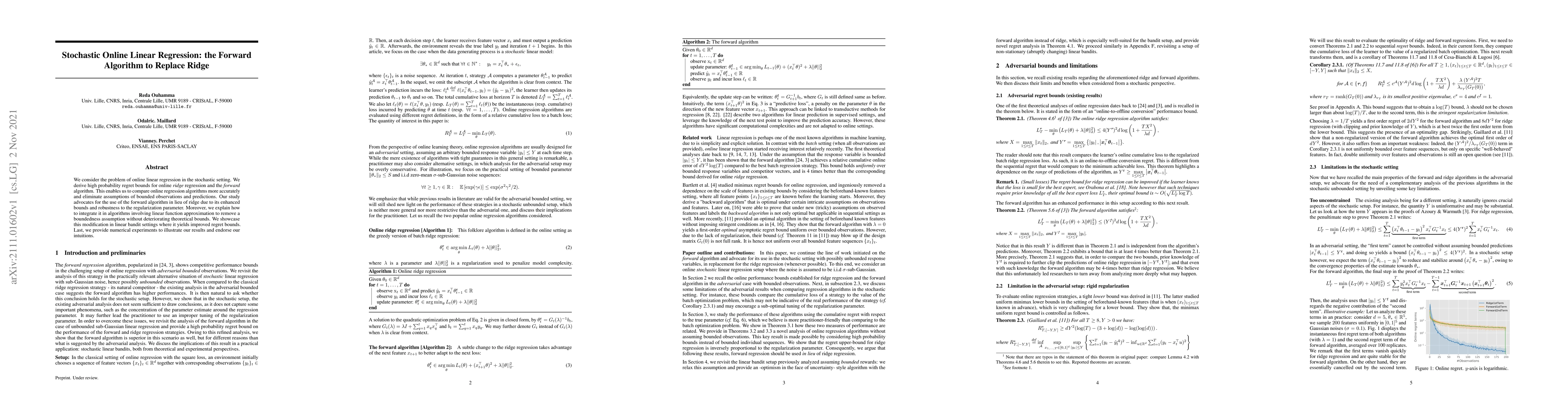 We consider the problem of online linear regression in the stochastic setting. We derive high probability regret bounds for online ridge regression and the forward algorithm. This enables us to compare online regression algorithms more accurately and eliminate assumptions of bounded observations and predictions. Our study advocates for the use of the forward algorithm in lieu of ridge due to its enhanced bounds and robustness to the regularization parameter. Moreover, we explain how to integrate it in algorithms involving linear function approximation to remove a boundedness assumption without deteriorating theoretical bounds. We showcase this modification in linear bandit settings where it yields improved regret bounds. Last, we provide numerical experiments to illustrate our results and endorse our intuitions.