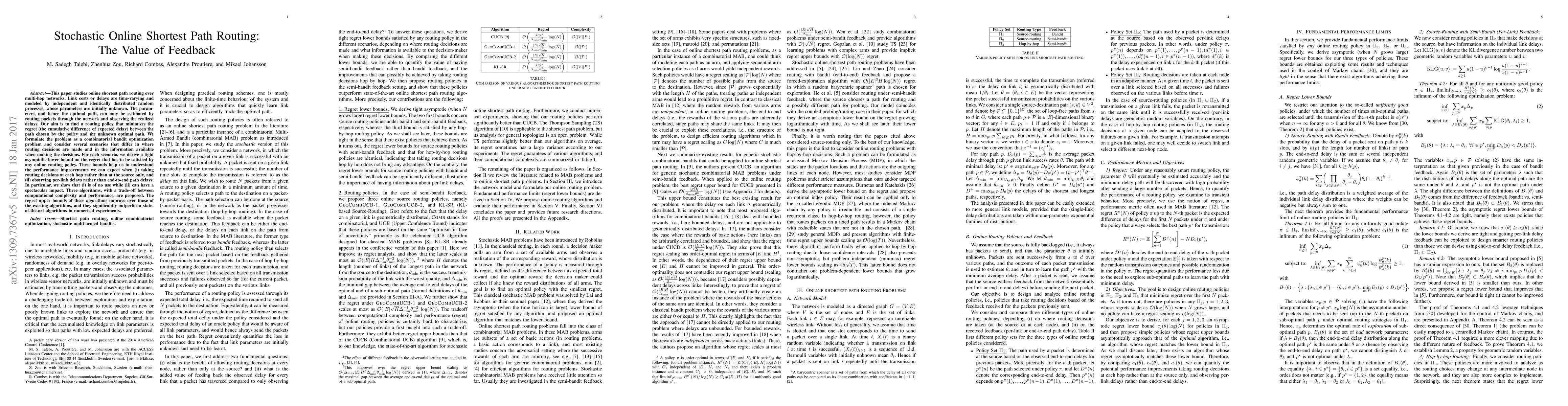 This paper investigates online shortest path routing in multi-hop networks with time-varying link costs, modeled as random processes. It proposes algorithms to minimize regret by leveraging feedback from observed delays, showing that observing per-link delays significantly improves performance over end-to-end path delays.