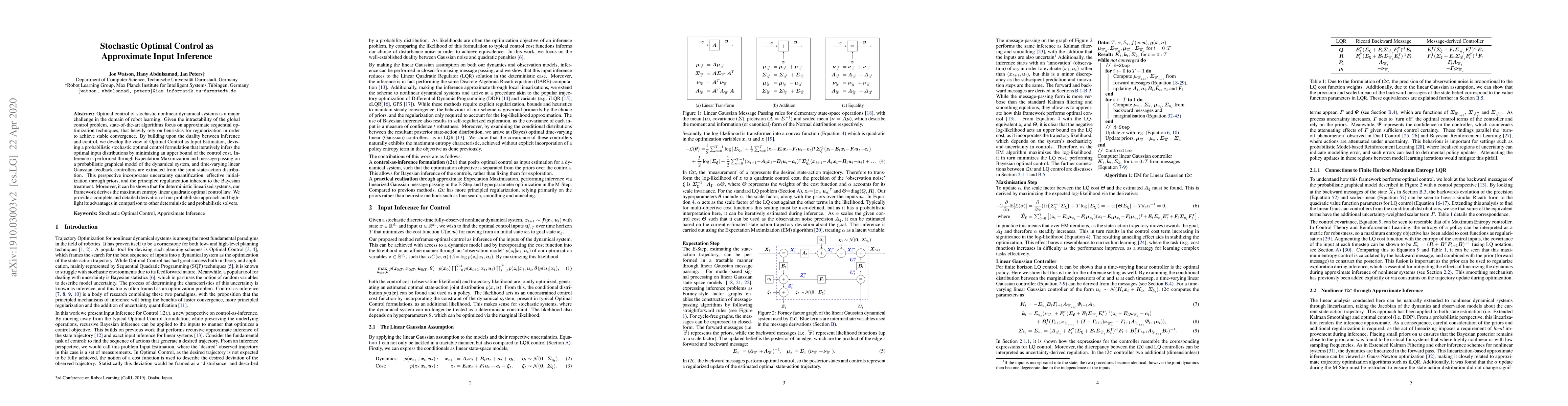 This paper proposes a probabilistic approach to stochastic optimal control by framing it as approximate input inference, leveraging Expectation Maximization and message passing to iteratively estimate optimal input distributions. This method incorporates uncertainty quantification, effective initialization, and principled regularization, ultimately deriving the maximum entropy linear quadratic optimal control law for deterministic systems.