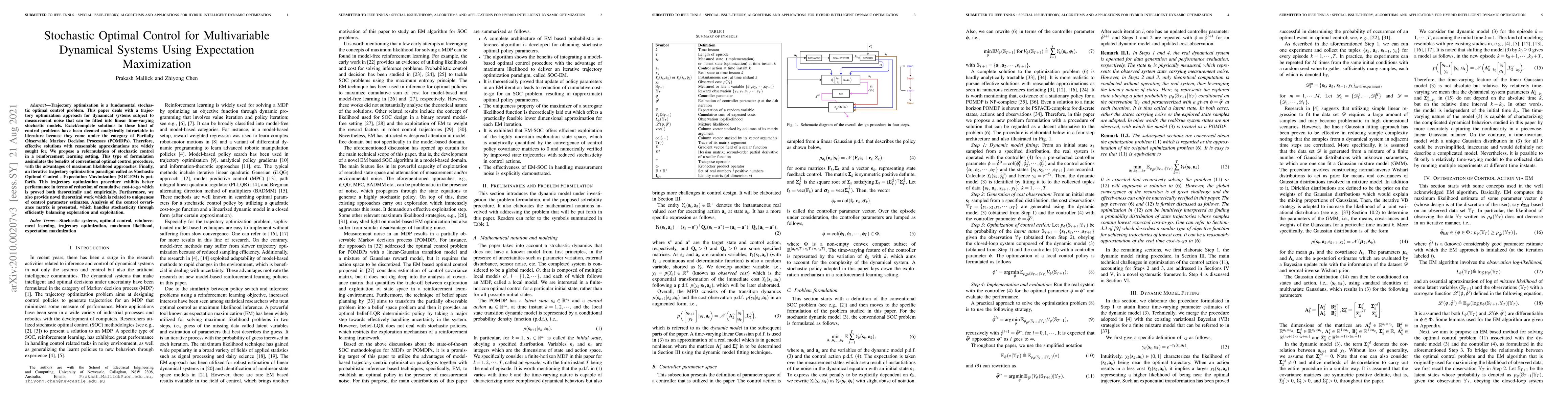 This paper proposes the Stochastic Optimal Control - Expectation Maximization (SOC-EM) method for optimizing trajectories in noisy, multivariable dynamical systems, reformulating stochastic control as a reinforcement learning problem. The SOC-EM approach combines optimal control and maximum likelihood techniques, offering improved performance in reducing cumulative cost-to-go, supported by both theoretical and empirical evidence. It also provides novel insights into the uniqueness of control parameter estimates and efficient handling of stochasticity.