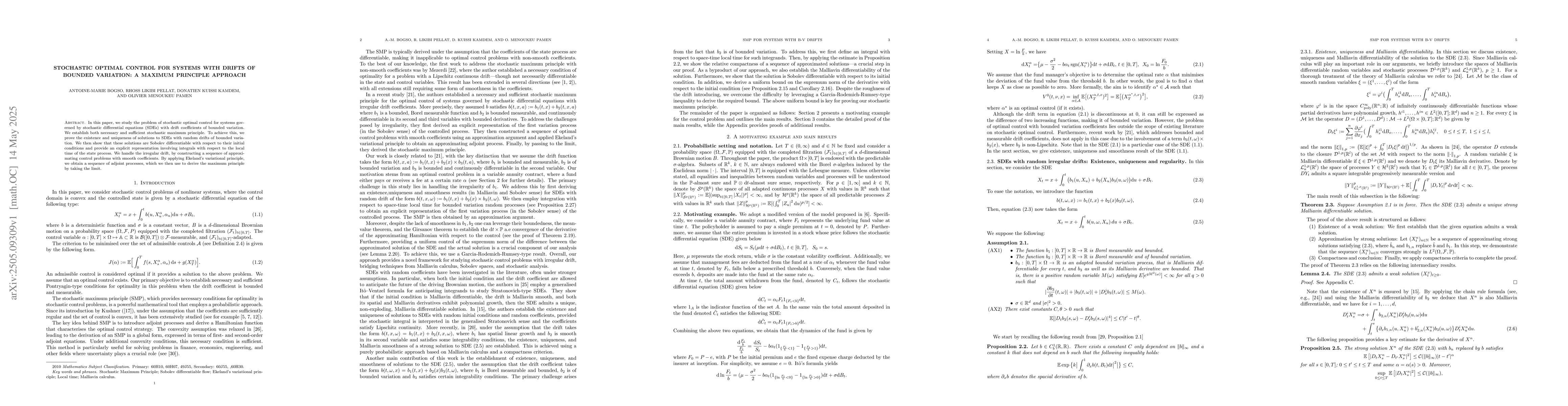 The paper presents a stochastic maximum principle for systems with drifts of bounded variation, along with proofs of existence, uniqueness, and regularity of solutions, utilizing Ekeland's variational principle and limiting processes.