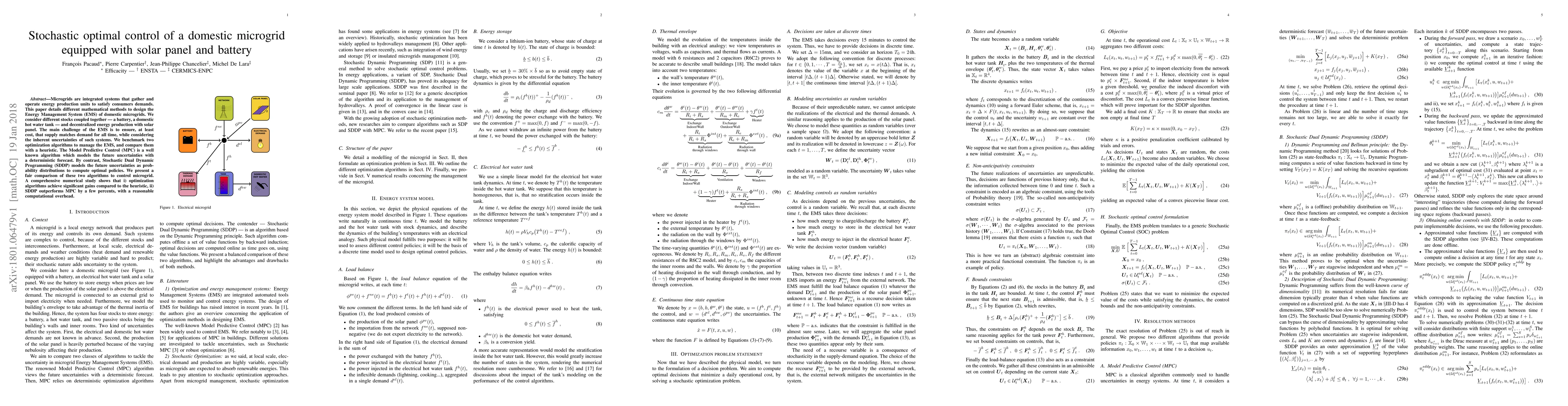 This paper presents a comparison of two optimization algorithms for designing an Energy Management System in domestic microgrids with solar panels and batteries. SDDP outperforms MPC by a few percent, achieving significant gains over a heuristic approach.