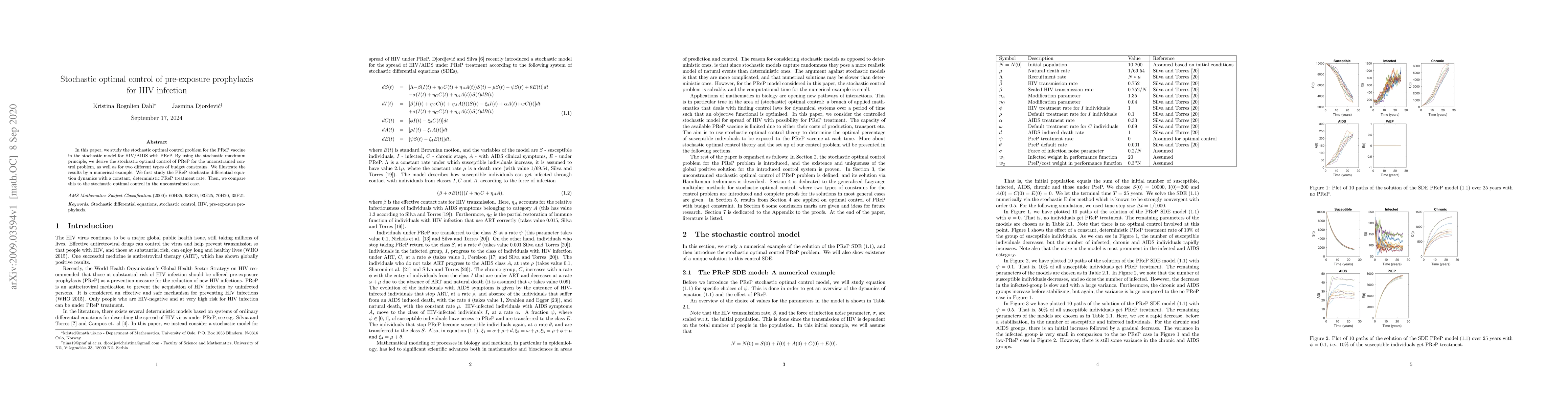 This paper explores the stochastic optimal control of the PReP vaccine in a model for HIV/AIDS, deriving optimal strategies using the stochastic maximum principle under both unconstrained and budget-constrained scenarios, and illustrating results with a numerical example.