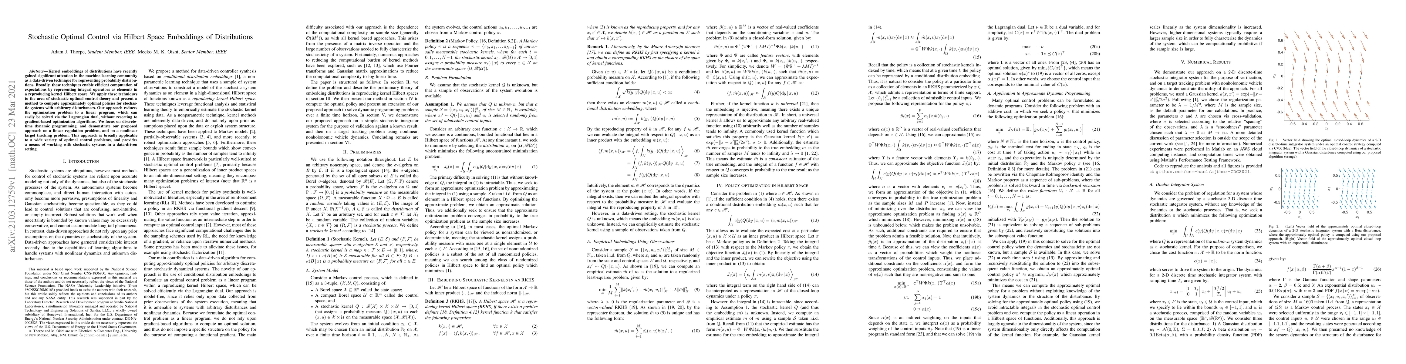 This paper introduces a novel method for stochastic optimal control using kernel embeddings of distributions, transforming the optimization problem into a linear program solvable via the Lagrangian dual. The approach is demonstrated on linear regulation and nonlinear target tracking, showing its applicability to various optimal control problems.
