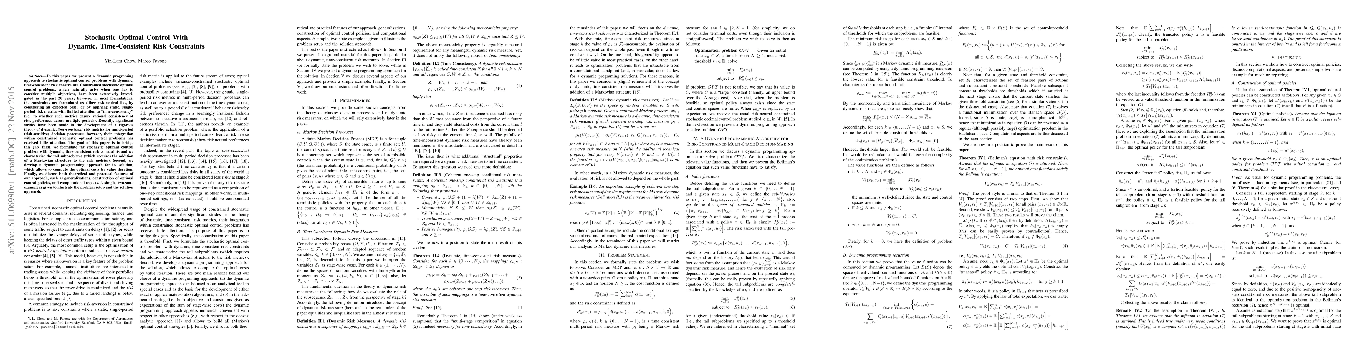 This paper develops a dynamic programming approach to solve stochastic optimal control problems with dynamic, time-consistent risk constraints, addressing the gap in integrating rigorous time-consistent risk metrics into multi-period decision processes. The authors formulate the problem, characterize the tail subproblems, and propose a value iteration method for optimal cost computation, illustrated with a simple two-state example.