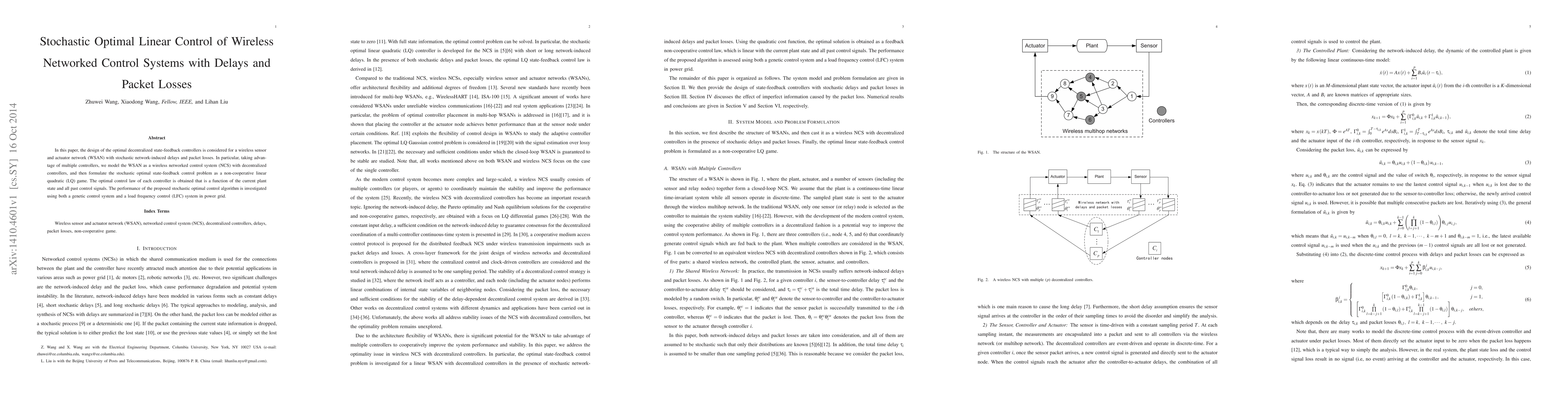 This paper designs optimal decentralized state-feedback controllers for a wireless sensor and actuator network (WSAN) dealing with stochastic delays and packet losses. The authors formulate the control problem as a non-cooperative linear quadratic game and derive the optimal control law for each controller based on plant state and past control signals.