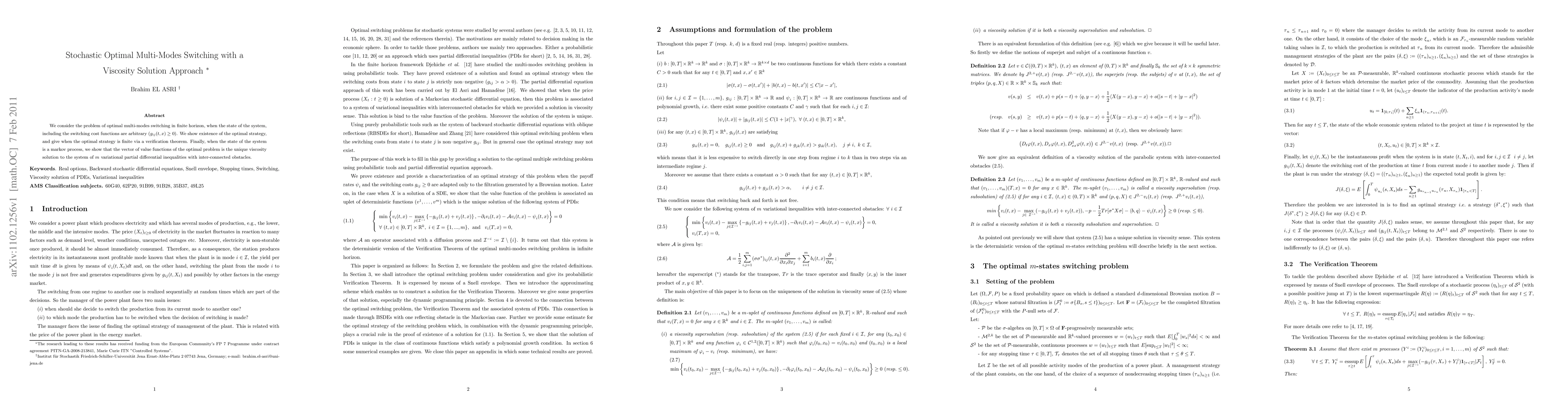 This research paper explores optimal multi-modes switching with a focus on existence and uniqueness of solutions in finite horizon problems. It shows that the vector of value functions is a unique viscosity solution to a system of partial differential inequalities when the system state is a Markov process.