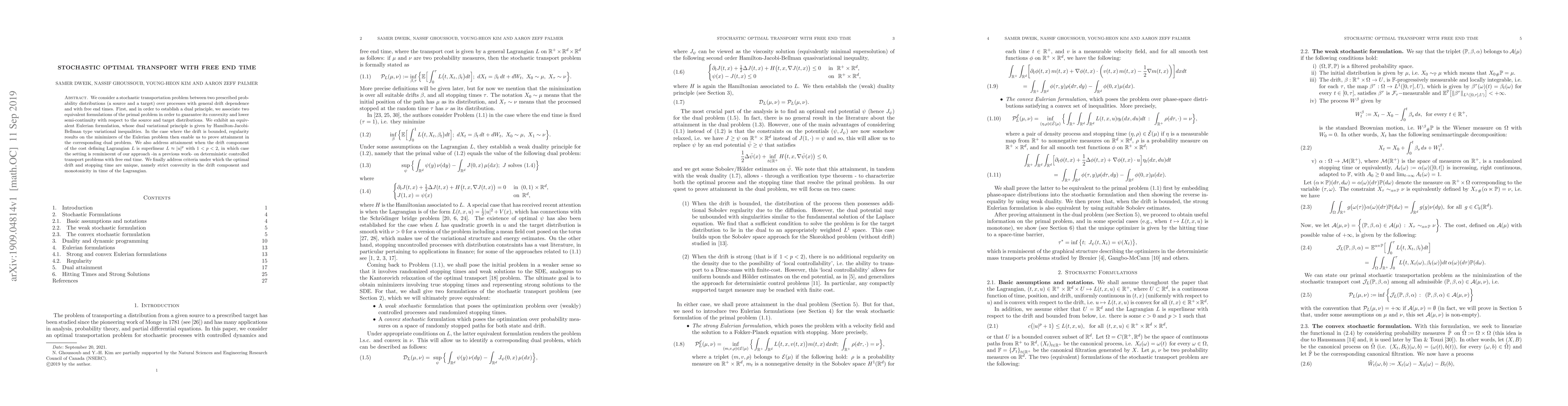 We consider a stochastic transportation problem between two prescribed probability distributions (a source and a target) over processes with general drift dependence and with free end times. First, and in order to establish a dual principle, we associate two equivalent formulations of the primal problem in order to guarantee its convexity and lower semi-continuity with respect to the source and target distributions. We exhibit an equivalent Eulerian formulation, whose dual variational principle is given by Hamilton-Jacobi-Bellman type variational inequalities. In the case where the dependence on the drift is bounded, regularity results on the minimizers of the Eulerian problem then enable us to prove attainment in the corresponding dual problem. We also address attainment when the drift component of the cost defining Lagrangian $L$ is superlinear $L \approx |u|^p$ with $1