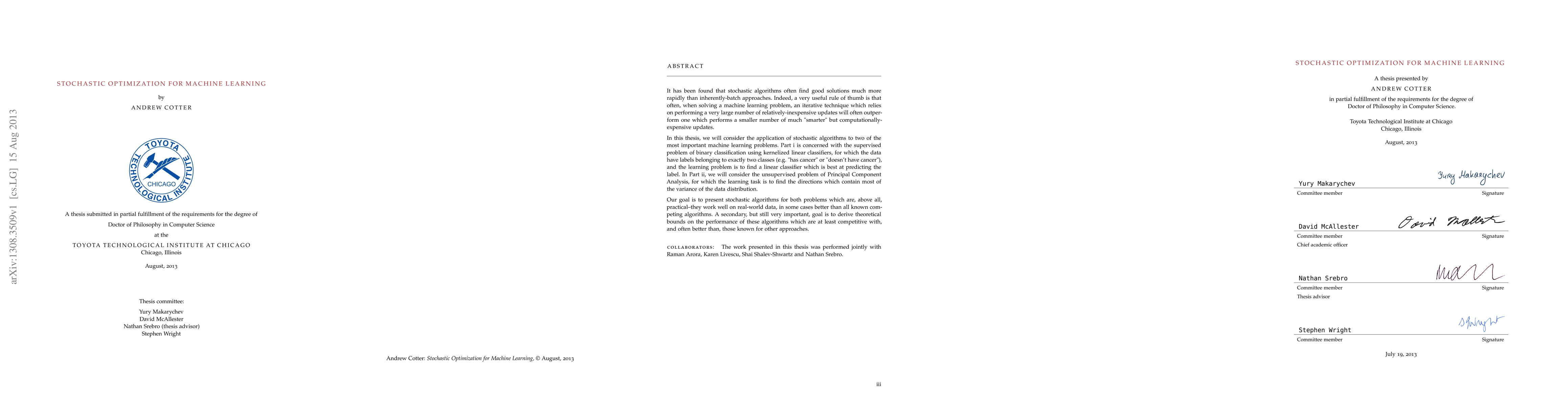 It has been found that stochastic algorithms often find good solutions much more rapidly than inherently-batch approaches. Indeed, a very useful rule of thumb is that often, when solving a machine learning problem, an iterative technique which relies on performing a very large number of relatively-inexpensive updates will often outperform one which performs a smaller number of much "smarter" but computationally-expensive updates. In this thesis, we will consider the application of stochastic algorithms to two of the most important machine learning problems. Part i is concerned with the supervised problem of binary classification using kernelized linear classifiers, for which the data have labels belonging to exactly two classes (e.g. "has cancer" or "doesn't have cancer"), and the learning problem is to find a linear classifier which is best at predicting the label. In Part ii, we will consider the unsupervised problem of Principal Component Analysis, for which the learning task is to find the directions which contain most of the variance of the data distribution. Our goal is to present stochastic algorithms for both problems which are, above all, practical--they work well on real-world data, in some cases better than all known competing algorithms. A secondary, but still very important, goal is to derive theoretical bounds on the performance of these algorithms which are at least competitive with, and often better than, those known for other approaches.