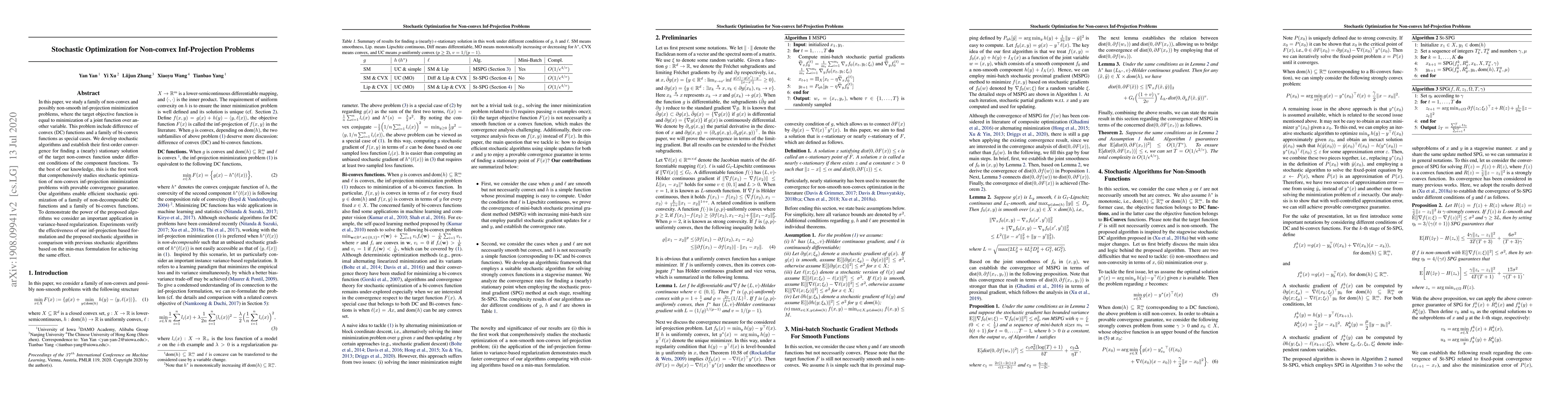 This paper develops stochastic algorithms for solving non-convex inf-projection minimization problems, including DC and bi-convex functions, and proves their first-order convergence. The proposed algorithms are shown to outperform previous methods in variance-based regularization applications.