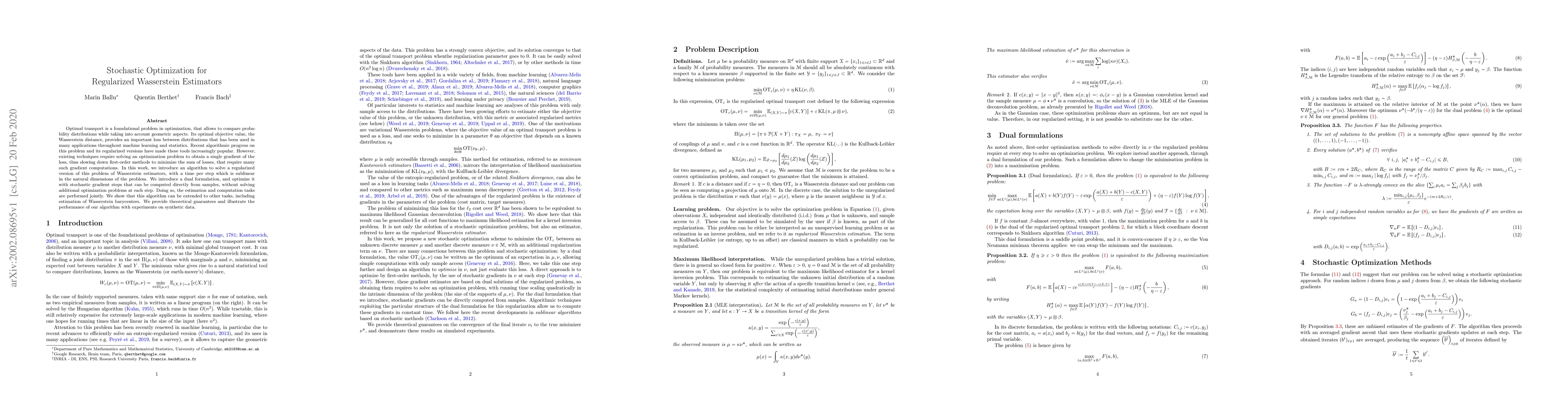 This paper introduces a novel stochastic optimization algorithm for regularized Wasserstein estimators, achieving sublinear time per step by leveraging a dual formulation and direct sample-based gradient computations, thus improving the efficiency of first-order optimization methods. The method is also extended to estimate Wasserstein barycenters, with theoretical guarantees and demonstrated performance on synthetic data.