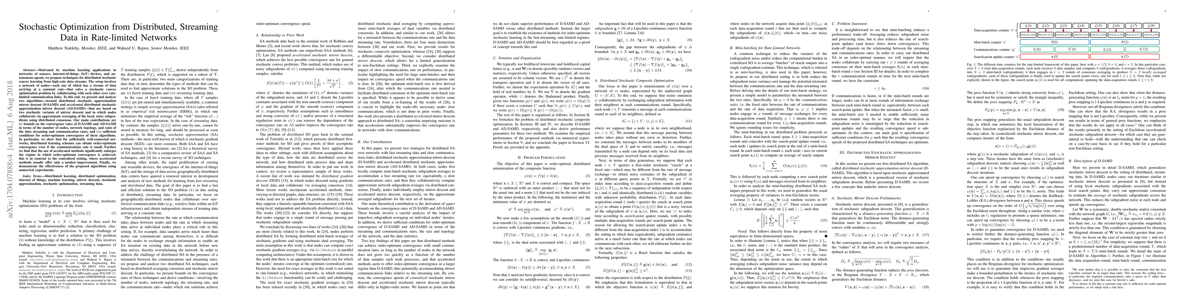Motivated by machine learning applications in networks of sensors, internet-of-things (IoT) devices, and autonomous agents, we propose techniques for distributed stochastic convex learning from high-rate data streams. The setup involves a network of nodes---each one of which has a stream of data arriving at a constant rate---that solve a stochastic convex optimization problem by collaborating with each other over rate-limited communication links. To this end, we present and analyze two algorithms---termed distributed stochastic approximation mirror descent (D-SAMD) and accelerated distributed stochastic approximation mirror descent (AD-SAMD)---that are based on two stochastic variants of mirror descent and in which nodes collaborate via approximate averaging of the local, noisy subgradients using distributed consensus. Our main contributions are (i) bounds on the convergence rates of D-SAMD and AD-SAMD in terms of the number of nodes, network topology, and ratio of the data streaming and communication rates, and (ii) sufficient conditions for order-optimum convergence of these algorithms. In particular, we show that for sufficiently well-connected networks, distributed learning schemes can obtain order-optimum convergence even if the communications rate is small. Further we find that the use of accelerated methods significantly enlarges the regime in which order-optimum convergence is achieved; this is in contrast to the centralized setting, where accelerated methods usually offer only a modest improvement. Finally, we demonstrate the effectiveness of the proposed algorithms using numerical experiments.