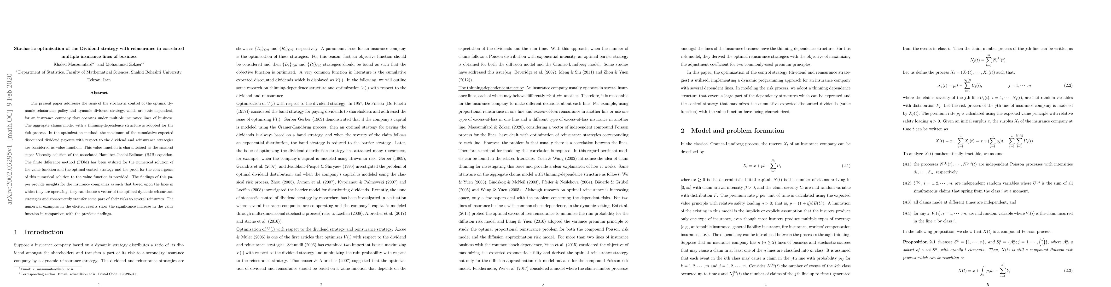 This paper optimizes the dynamic reinsurance and dividend strategies for an insurance company managing multiple correlated insurance lines, using a stochastic control approach. The finite difference method is employed to solve the associated Hamilton-Jacobi-Bellman equation, providing insights for optimal risk management and reinsurance decisions.