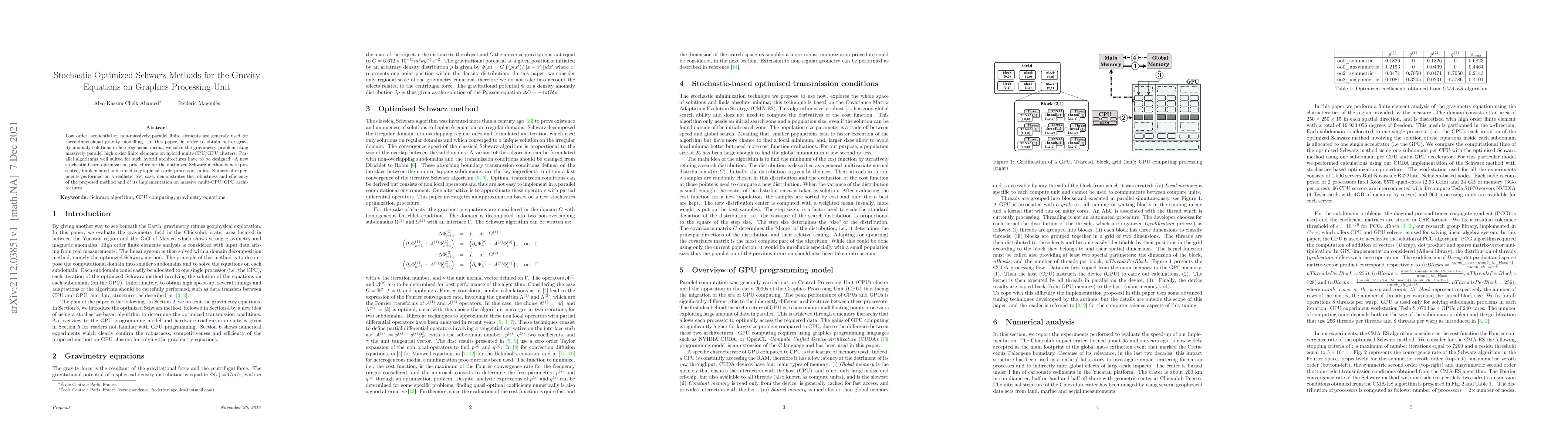 Low order, sequential or non-massively parallel finite elements are generaly used for three-dimensional gravity modelling. In this paper, in order to obtain better gravity anomaly solutions in heterogeneous media, we solve the gravimetry problem using massively parallel high order finite elements on hybrid multi-CPU/GPU clusters. Parallel algorithms well suited for such hybrid architectures have to be designed. A new stochastic-based optimization procedure for the optimized Schwarz method is here presented, implemented and tuned to graphical cards processors units. Numerical experiments performed on a reallistic test case, demonstrates the robustness and efficiency of the proposed method and of its implementation on massive multi-CPU/GPU architectures.