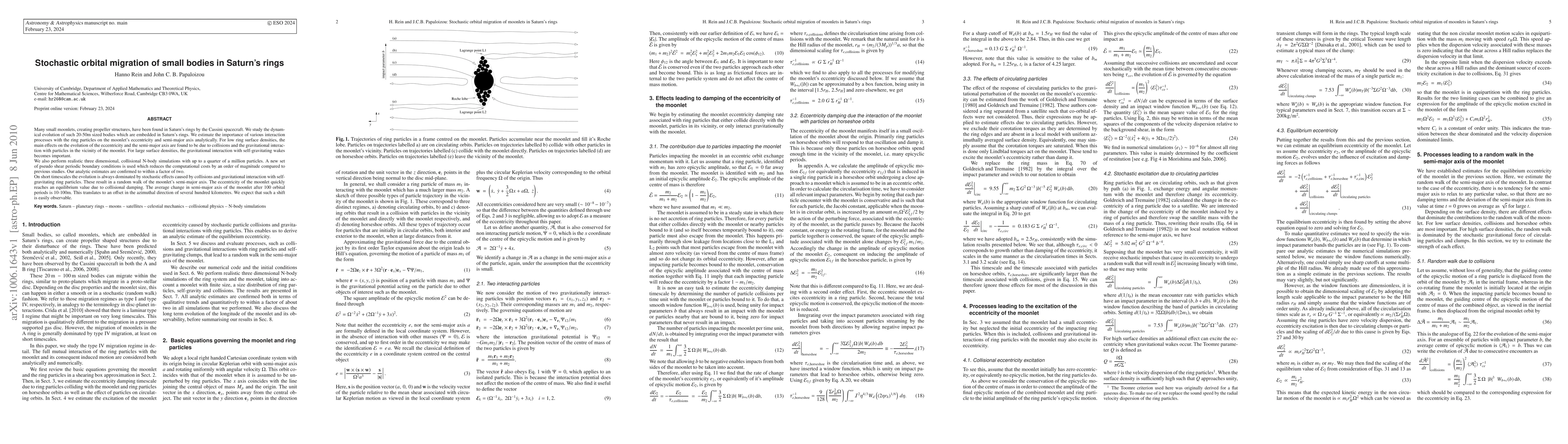 This paper investigates the stochastic orbital migration of small moonlets in Saturn's rings, finding that their semi-major axis undergoes a random walk due to collisions and gravitational interactions. The eccentricity reaches equilibrium quickly, while the semi-major axis shifts by 10-100m over 100 orbital periods, an observable effect.
