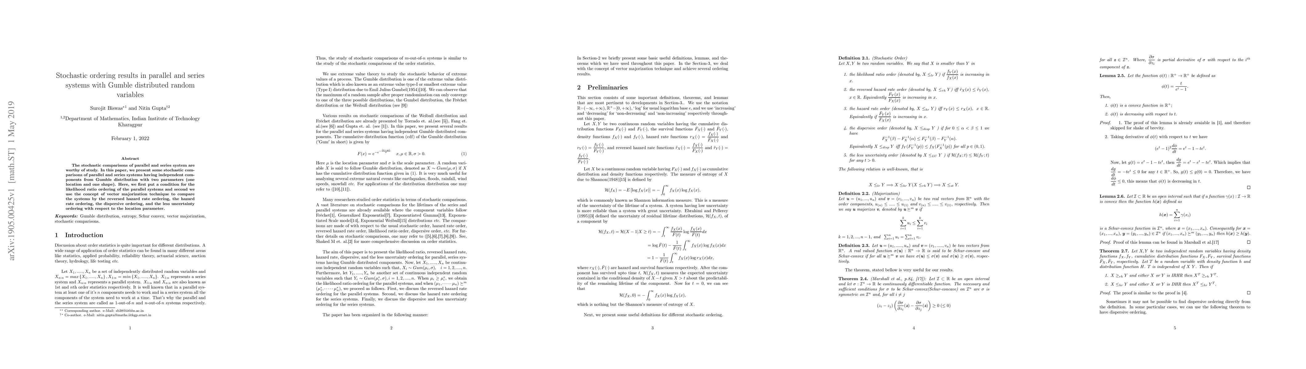 This paper investigates stochastic comparisons of parallel and series systems with components following Gumbel distribution. It establishes likelihood ratio ordering conditions for parallel systems and uses vector majorization to compare systems via reversed hazard rate, hazard rate, dispersive, and less uncertainty orderings based on the location parameter.