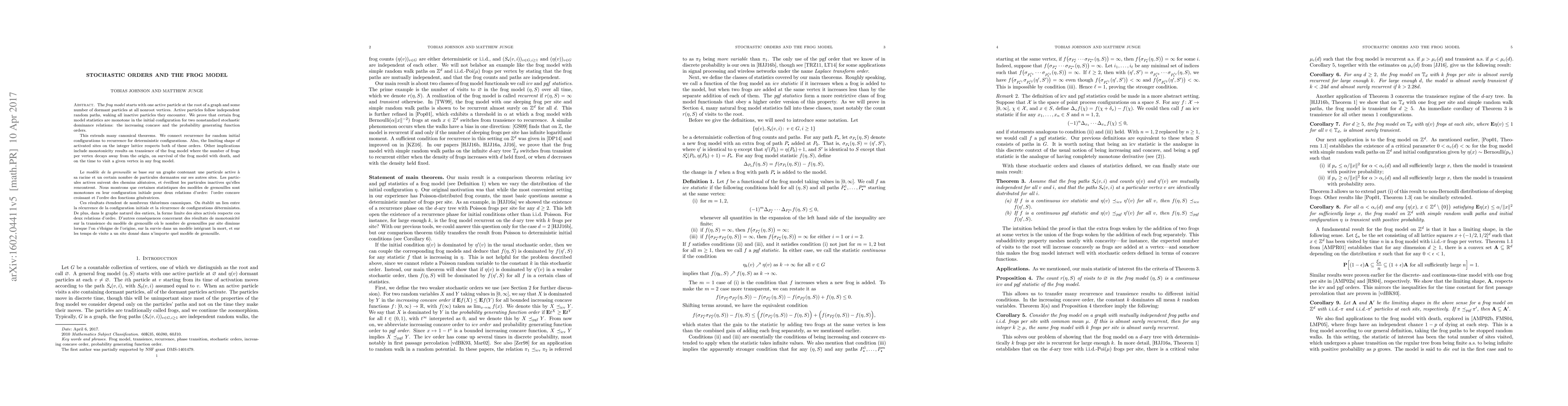 The frog model demonstrates monotonicity in statistics under increasing concave and probability generating function orders, extending classical theorems and linking random to deterministic recurrences. The limiting shape of activated sites on the integer lattice also respects these orders, with implications for transience, survival, and visit times.