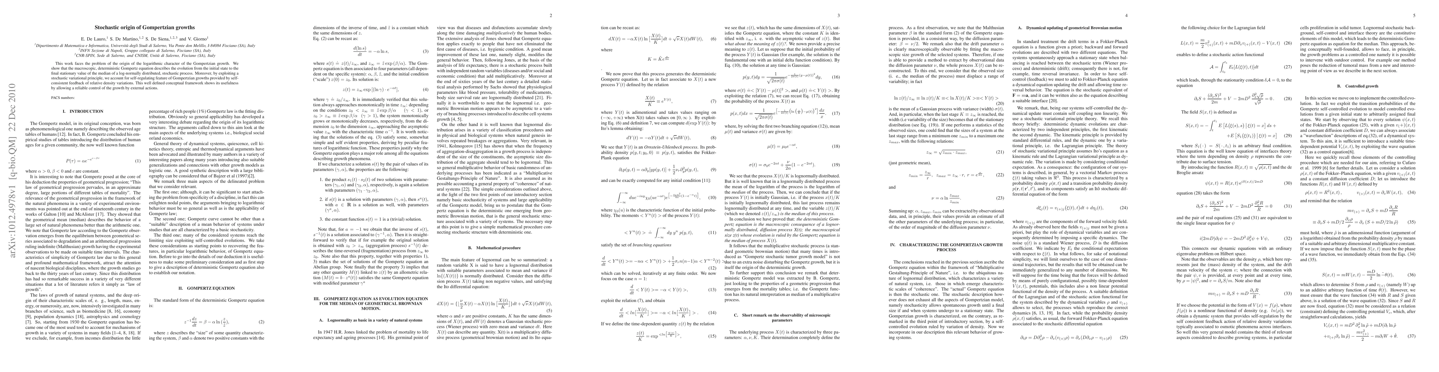 This work faces the problem of the origin of the logarithmic character of the Gompertzian growth. We show that the macroscopic, deterministic Gompertz equation describes the evolution from the initial state to the final stationary value of the median of a log-normally distributed, stochastic process. Moreover, by exploiting a stochastic variational principle, we account for self-regulating feature of Gompertzian growths provided by self-consistent feedback of relative density variations. This well defined conceptual framework shows its usefulness by allowing a reliable control of the growth by external actions.