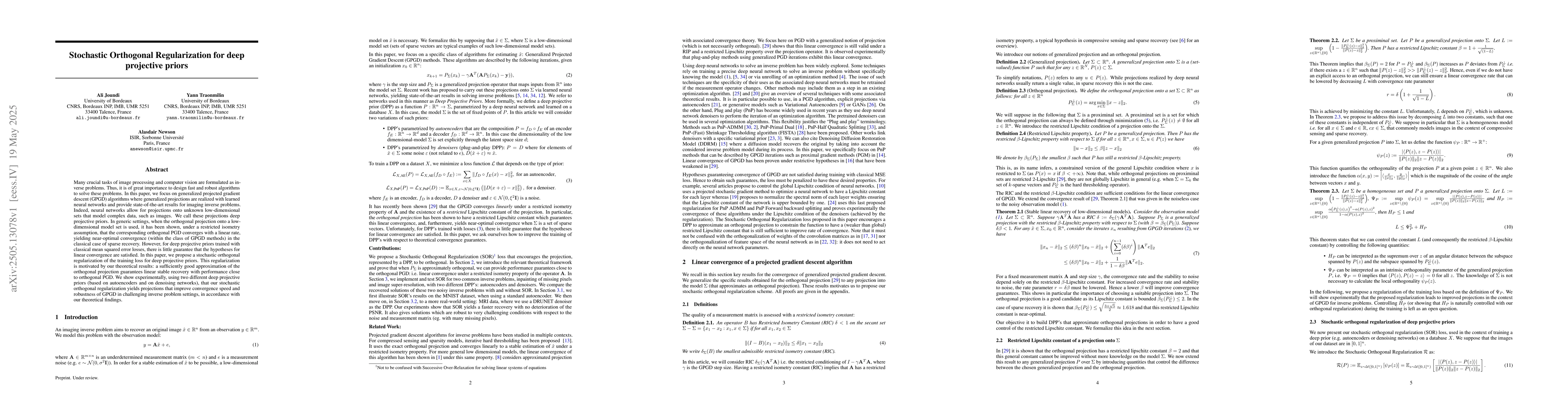 The paper proposes stochastic orthogonal regularization for training deep projective priors in generalized projected gradient descent (GPGD) algorithms for imaging inverse problems, ensuring linear convergence and improved performance.