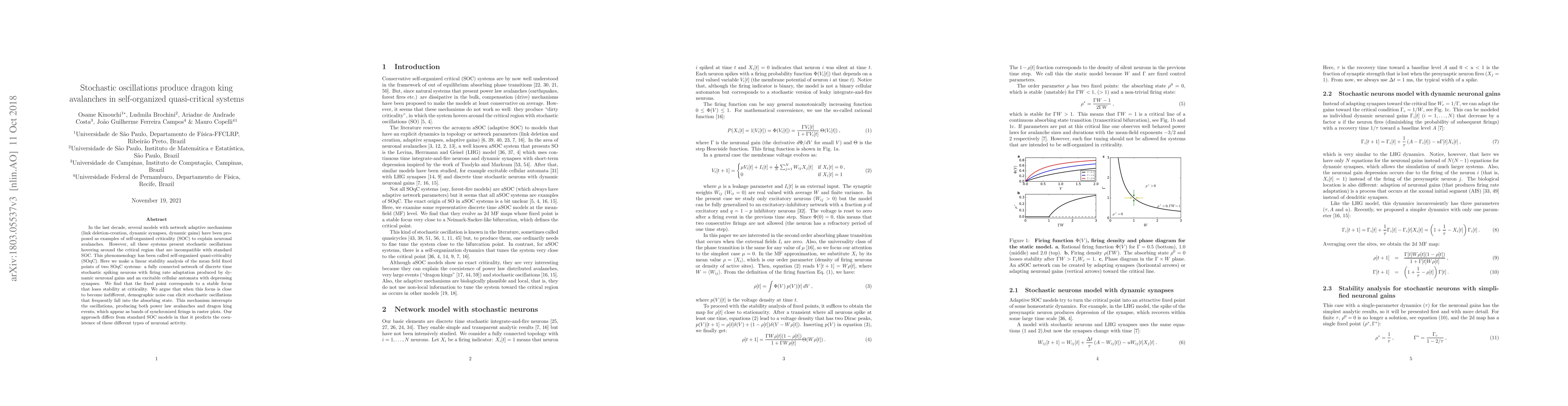 In the last decade, several models with network adaptive mechanisms (link deletion-creation, dynamic synapses, dynamic gains) have been proposed as examples of self-organized criticality (SOC) to explain neuronal avalanches. However, all these systems present stochastic oscillations hovering around the critical region that are incompatible with standard SOC. This phenomenology has been called self-organized quasi-criticality (SOqC). Here we make a linear stability analysis of the mean field fixed points of two SOqC systems: a fully connected network of discrete time stochastic spiking neurons with firing rate adaptation produced by dynamic neuronal gains and an excitable cellular automata with depressing synapses. We find that the fixed point corresponds to a stable focus that loses stability at criticality. We argue that when this focus is close to become indifferent, demographic noise can elicit stochastic oscillations that frequently fall into the absorbing state. This mechanism interrupts the oscillations, producing both power law avalanches and dragon king events, which appear as bands of synchronized firings in raster plots. Our approach differs from standard SOC models in that it predicts the coexistence of these different types of neuronal activity.