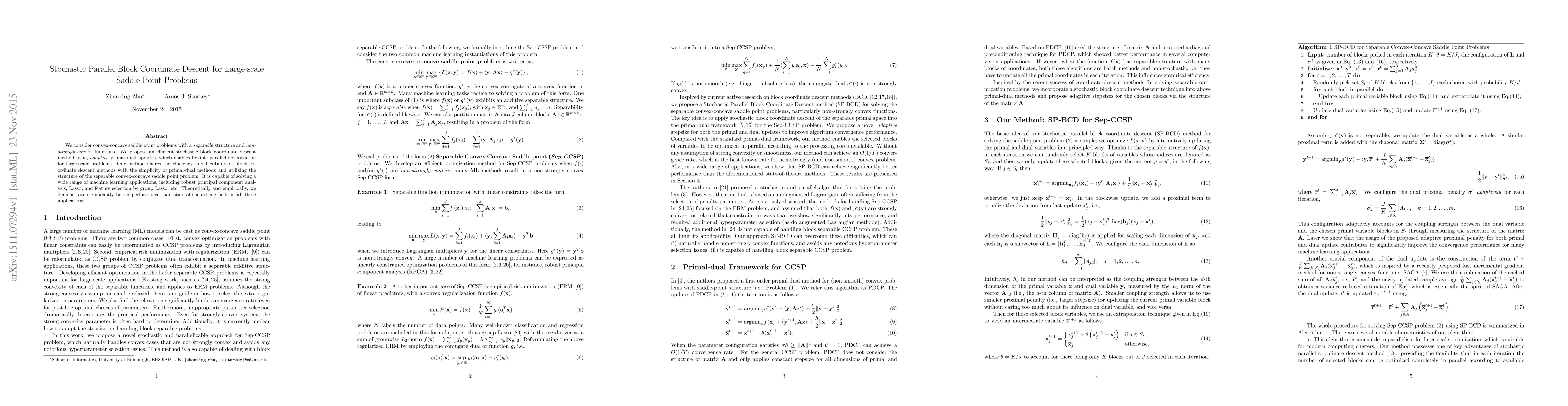 We consider convex-concave saddle point problems with a separable structure and non-strongly convex functions. We propose an efficient stochastic block coordinate descent method using adaptive primal-dual updates, which enables flexible parallel optimization for large-scale problems. Our method shares the efficiency and flexibility of block coordinate descent methods with the simplicity of primal-dual methods and utilizing the structure of the separable convex-concave saddle point problem. It is capable of solving a wide range of machine learning applications, including robust principal component analysis, Lasso, and feature selection by group Lasso, etc. Theoretically and empirically, we demonstrate significantly better performance than state-of-the-art methods in all these applications.