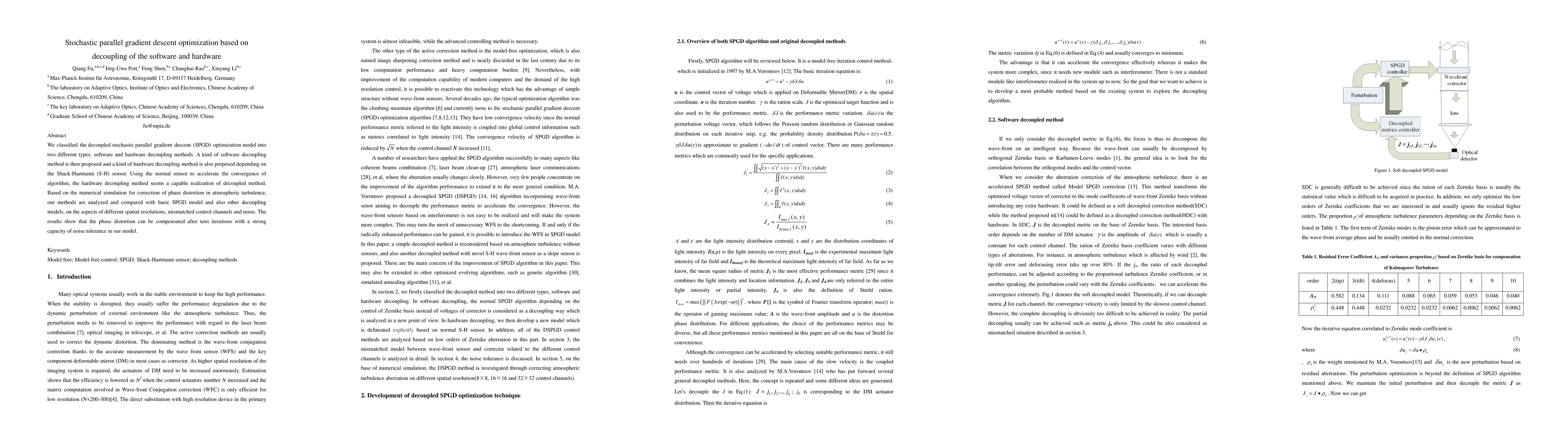This paper proposes two types of decoupled stochastic parallel gradient descent (SPGD) optimization methods: software and hardware decoupling. The hardware method, utilizing a Shack-Hartmann sensor, accelerates algorithm convergence, demonstrating strong noise tolerance and effective phase distortion correction in atmospheric turbulence simulations.